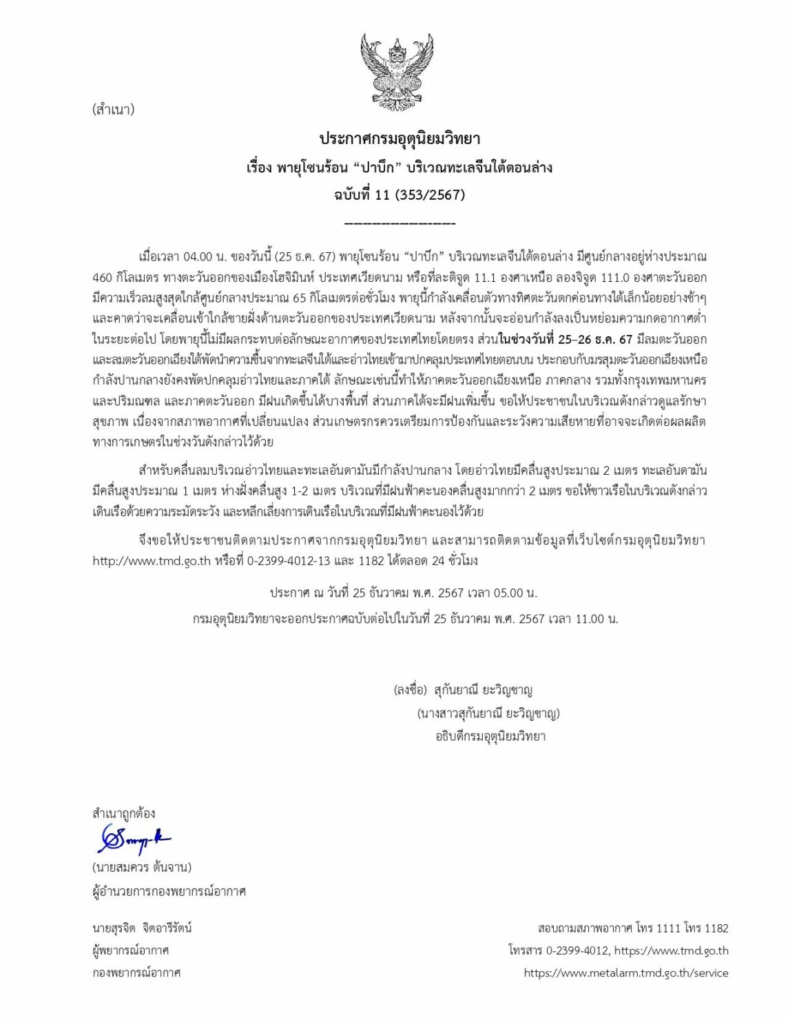 น.ส.สุกันยาณี ยะวิญชาญ อธิบดีกรมอุตุนิยมวิทยา ออกประกาศกรมอุตุนิยมวิทยา เกี่ยวข้องกับ พายุโซนร้อน “ปาบึก” บริเวณทะเลจีนใต้ตอนล่าง ฉบับที่ 11 (353/2567) โดยมีเนื้อหาดังนี้