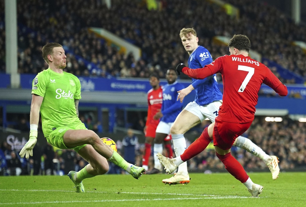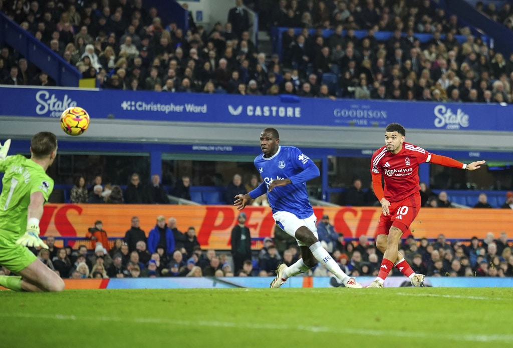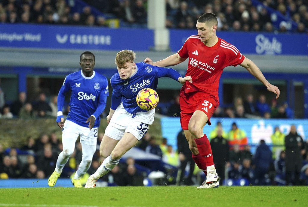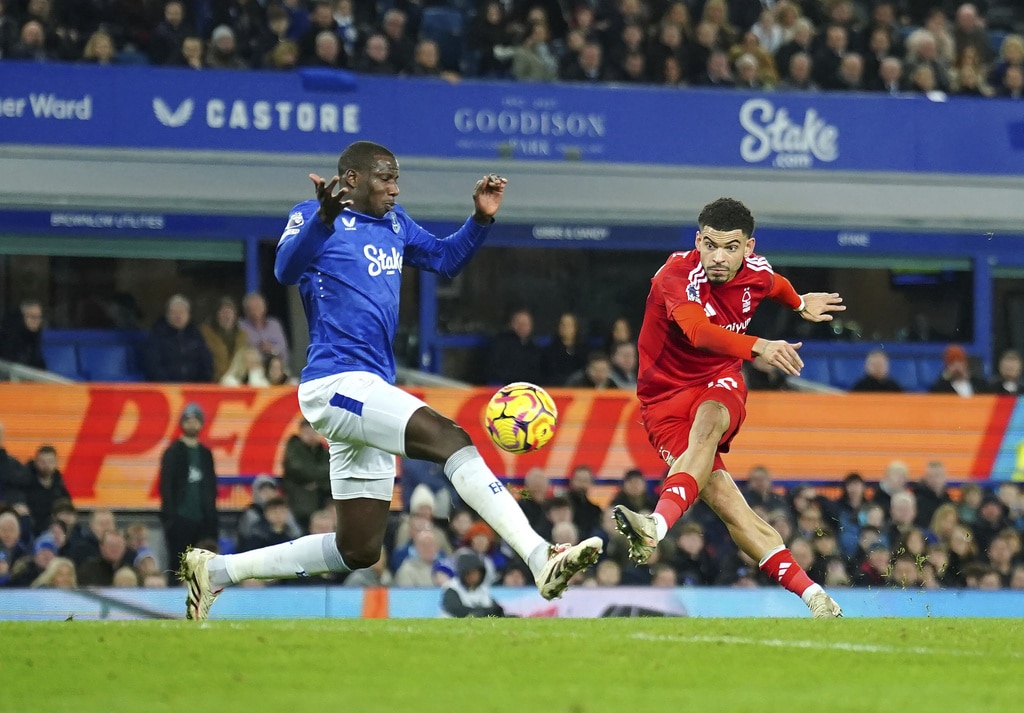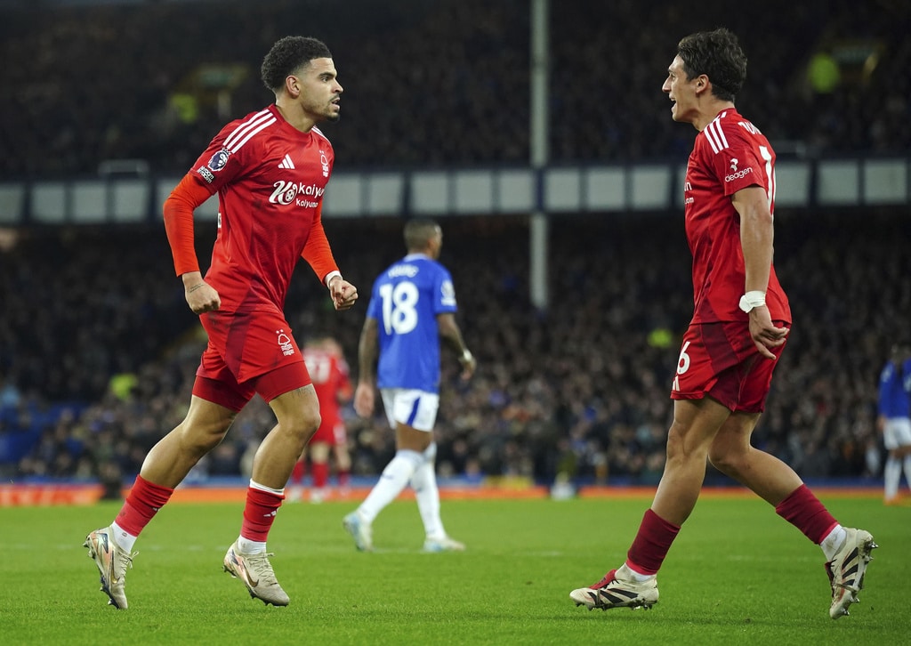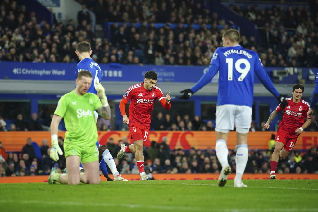 Everton’s Jarrad Branthwaite, centre, and Nottingham Forest’s Nikola Milenkovic battle for the ball during the English Premier League soccer match between Everton and Nottingham Forest at Goodison Park, Liverpool, England, Sunday, Dec. 29, 2024. (Peter Byrne/PA via AP)Everton goalkeeper Jordan Pickford, left, saves a shot from Nottingham Forest’s Neco Williams, right, during the English Premier League soccer match between Everton and Nottingham Forest at Goodison Park, Liverpool, England, Sunday, Dec. 29, 2024. (Peter Byrne/PA via AP)Nottingham Forest’s Morgan Gibbs-White, left, celebrates scoring their side’s second goal during the English Premier League soccer match between Everton and Nottingham Forest at Goodison Park, Liverpool, England, Sunday, Dec. 29, 2024. (Peter Byrne/PA via AP)Nottingham Forest’s Morgan Gibbs-White, centre, celebrates scoring their side’s second goal during the English Premier League soccer match between Everton and Nottingham Forest at Goodison Park, Liverpool, England, Sunday, Dec. 29, 2024. (Peter Byrne/PA via AP)Nottingham Forest’s Morgan Gibbs-White, right, scores their side’s second goal during the English Premier League soccer match between Everton and Nottingham Forest at Goodison Park, Liverpool, England, Sunday, Dec. 29, 2024. (Peter Byrne/PA via AP)Nottingham Forest’s Morgan Gibbs-White, right, scores their side’s second goal during the English Premier League soccer match between Everton and Nottingham Forest at Goodison Park, Liverpool, England, Sunday, Dec. 29, 2024. (Peter Byrne/PA via AP)