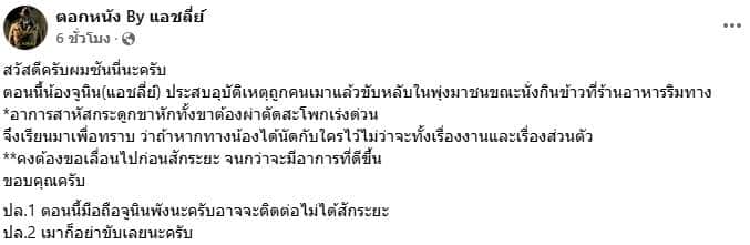 ตอนนี้น้องจูนิน(แอชลี่ย์) ประสบอุบัติเหตุถูกคนเมาแล้วขับหลับในพุ่งมาชนขณะนั่งกินข้าวที่ร้านอาหารริมทาง อาการสาหัสกระดูกขาหักทั้งขาต้องผ่าตัดสะโพกเร่งด่วน จึงเรียนมาเพื่อทราบ ว่าถ้าหากทางน้องได้นัดกับใครไว้ไม่ว่าจะทั้งเรื่องงานและเรื่องส่วนตัว
