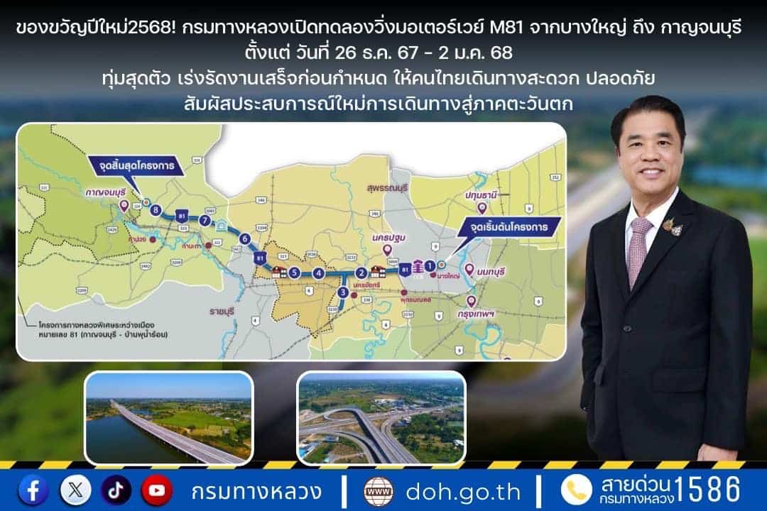 ของขวัญปีใหม่2568! กรมทางหลวงเปิดทดลองวิ่งมอเตอร์เวย์ M81 จากบางใหญ่ ถึง กาญจนบุรี ตั้งแต่วันที่ 26 ธ.ค.67 – 2 ม.ค. 68 ทุ่มสุดตัว เร่งรัดงานเสร็จก่อนกำหนด ให้คนไทยเดินทางสะดวก ปลอดภัย สัมผัสประสบการณ์ใหม่การเดินทางสู่ภาคตะวันตก