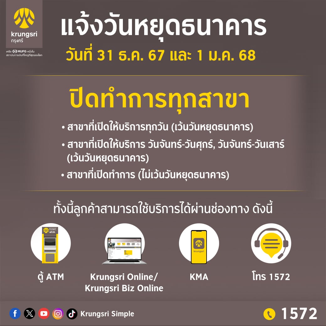 - 31 ธันวาคม 2567 – 1 มกราคม 2568 ปิดให้บริการทุกสาขา