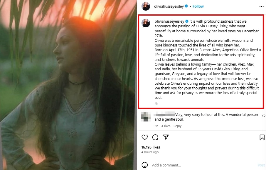 “It is with profound sadness that we announce the passing of Olivia Hussey Eisley, who went peacefully at home surrounded by her loved ones on December 27th.