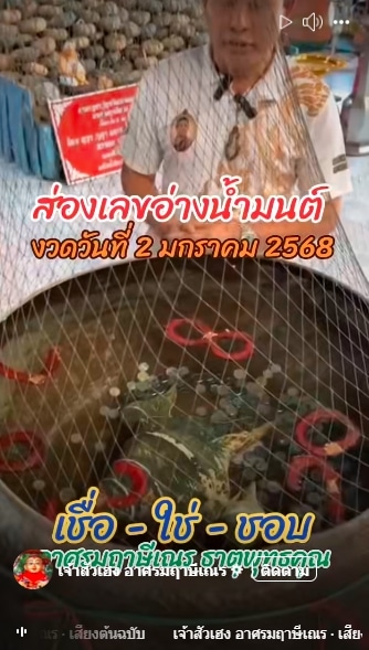ด้านเพจเฟซบุ๊ก เจ้าสัวเฮง อาศรมฤาษีเณร ก็อำนวยความสะดวกให้แก่นักเสี่ยงโชคทุกท่านที่ไม่สะดวกเดินทางไปยังวัดก็ได้มีการโพสต์คลิปให้เห็น เลขอ่างน้ำมนต์ 2/1/68 ด้วยเช่นกัน ซึ่งต้องบอกเลยว่าหยดน้ำตาเทียนสีแดงที่ลอยอยู่เหนือผิวน้ำนั้นยังคงชัดเจนเหมือนเช่นทุกงวดที่ผ่าน ๆ มา โดยในงวดปีใหม่นี้ปรากฎทั้งหมด 6 ตัวเลข คือ 8 7 9 0 3 2
