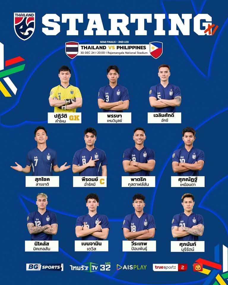 11 ตัวจริง ไทย พบ ฟิลิปปินส์ ฟุตบอลอาเซียน คัพ 2024 รอบรองฯ วันที่ 30 ธ.ค. 67 (ลิงก์ดูบอล)