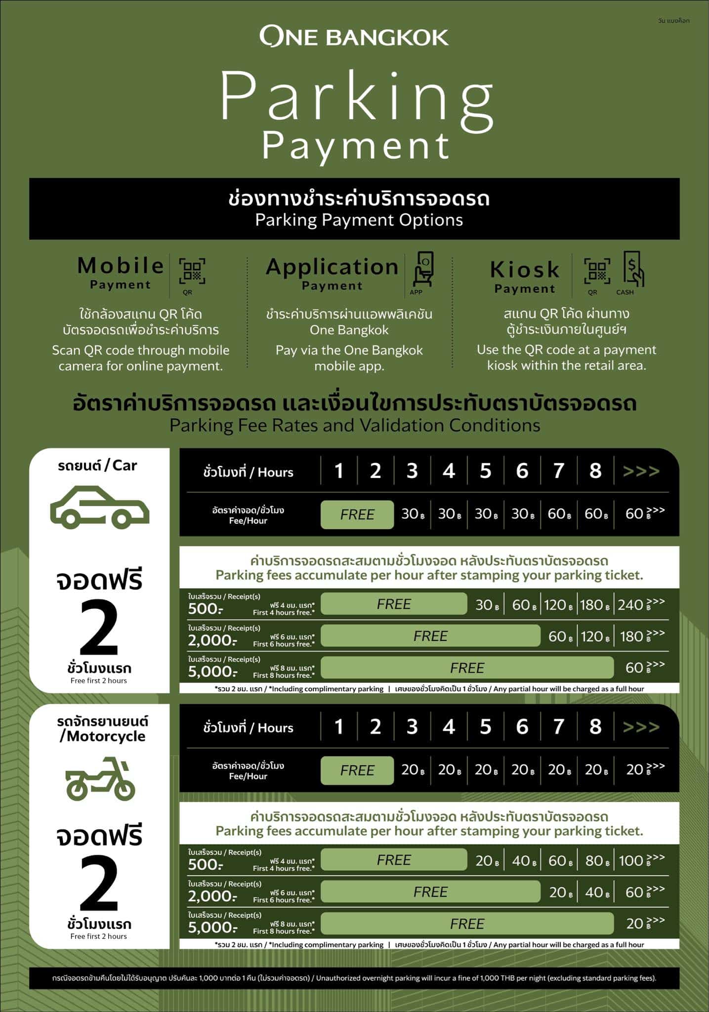 จอดฟรี 2 ชั่วโมงแรก อัตราค่าบริการชั่วโมงต่อไป 30 บาท/ชั่วโมง, 7 ชั่วโมงขึ้นไป 60 บาท/ชั่วโมง สามารถเช็คที่จอดรถได้ผ่านแอปพลิเคชัน One Bangkok