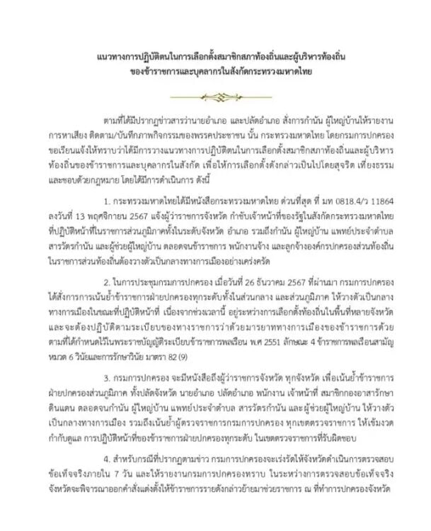 1. กระทรวงมหาดไทยได้มีหนังสือกระทรวงมหาดไทย ด่วนที่สุด ที่ มท 0818.4/ว 11864 ลงวันที่ 13 พฤศจิกายน 2567 แจ้งผู้ว่าราชการจังหวัด กำชับเจ้าหน้าที่ของรัฐในสังกัดกระทรวงมหาดไทยที่ปฏิบัติหน้าที่ในราชการส่วนภูมิภาคทั้งในระดับจังหวัด อำเภอ รวมถึงกำนัน ผู้ใหญ่บ้าน แพทย์ประจำตำบลสารวัตรกำนัน และผู้ช่วยผู้ใหญ่บ้าน ตลอดจนข้าราชการ พนักงานจ้าง และลูกจ้างองค์กรปกครองส่วนท้องถิ่นในราชการส่วนท้องถิ่นต้องวางตัวเป็นกลางทางการเมืองอย่างเคร่งครัด