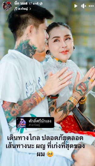 นอกจากนั้นในสตอรี่เฟซบุ๊กของ สามี อี๊ด สบู่สับปะรด ก็ได้โพสต์ภาพคู่ที่เห็นแล้วรู้เลยว่ามีความสุขกันมากแค่ไหน เพราะทุกอย่างบอกออกมาผ่านทางสายตาและรอยยิ้มของ อี๊ด สบู่สับปะรด พร้อมระบุข้อความว่า “เดินทางไกล ปลอดภัยตลอดเส้นทางนะ ผญ ที่เก่งที่สุดของผม”
