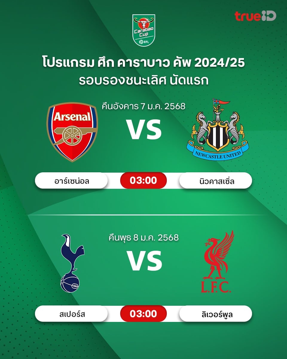 โปรแกรม คาราบาวคัพ 2024/25 รอบรองชนะเลิศ นัดแรก วันที่ 7-8 มกราคม 2568