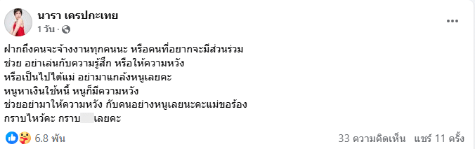 นารา เครปกะเทย หรือ อนิวัต ประทุมถิ่น อินฟลูเอนเซอร์ชื่อดัง ได้โพสต์ข้อความลงเฟซบุ๊กระบุว่า “ฝากถึงคนจะจ้างงานทุกคนนะ หรือคนที่อยากจะมีส่วนร่วม ช่วย อย่าเล่นกับความรู้สึก หรือให้ความหวัง หรือเป็นไปได้แม่ อย่ามาแกล้งหนูเลยคะ หนูหาเงินใช้หนี้ หนูก็มีความหวัง