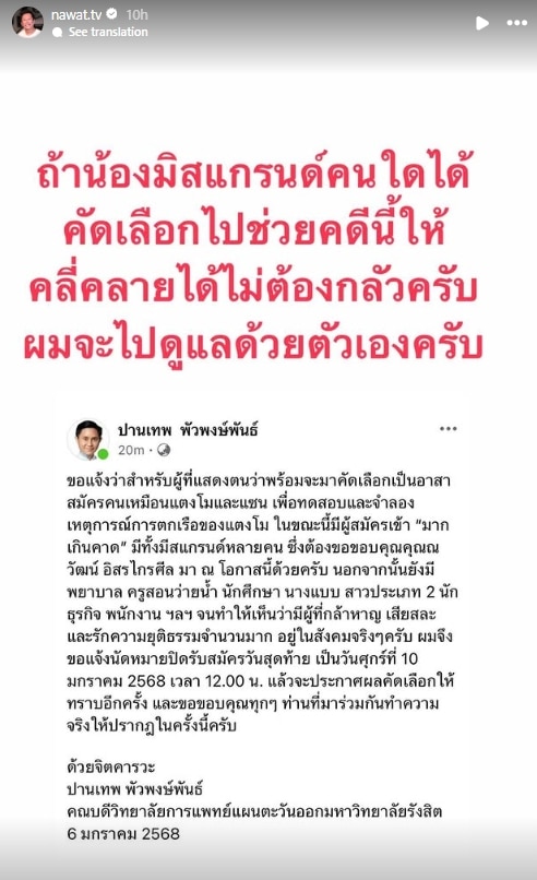 บอสณวัฒน์ ชวน ผู้เข้าประกวดมิสแกรนด์ 2025 หุ่นคล้าย แตงโม-แซน สมัครเป็นอาสา ช่วย อ.ปานเทพ จำลองเหตุการณ์ คดีแตงโมตกเรือ