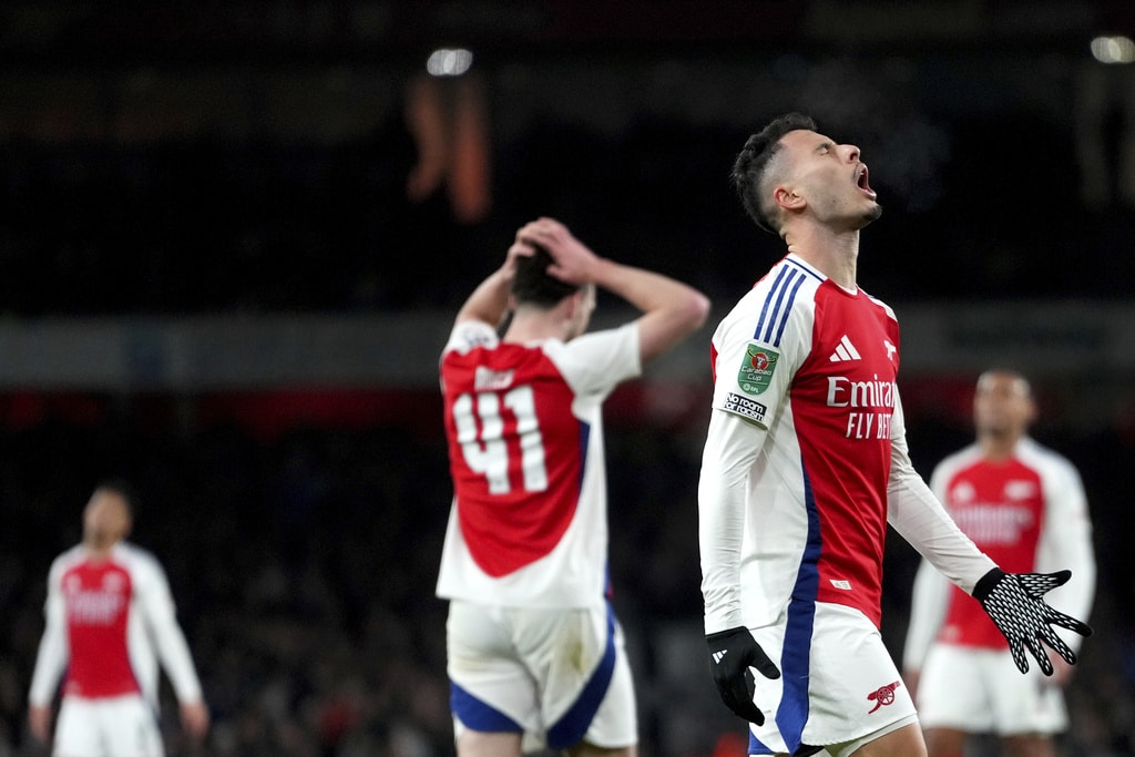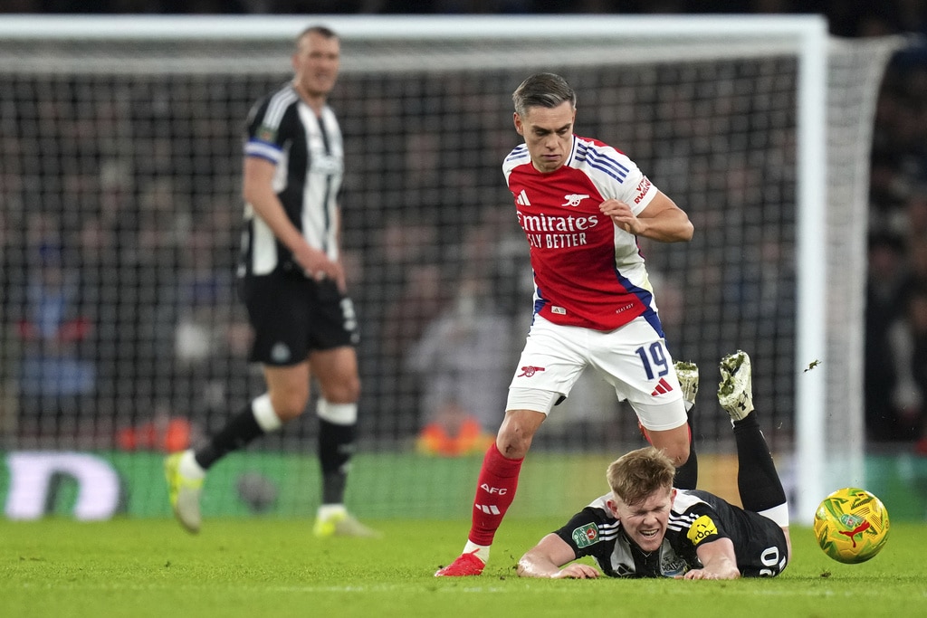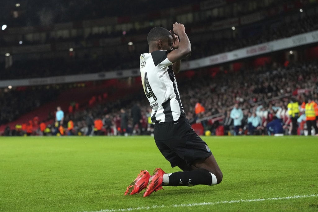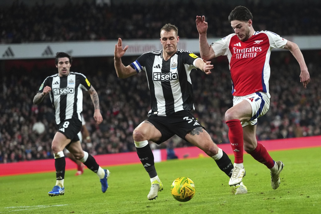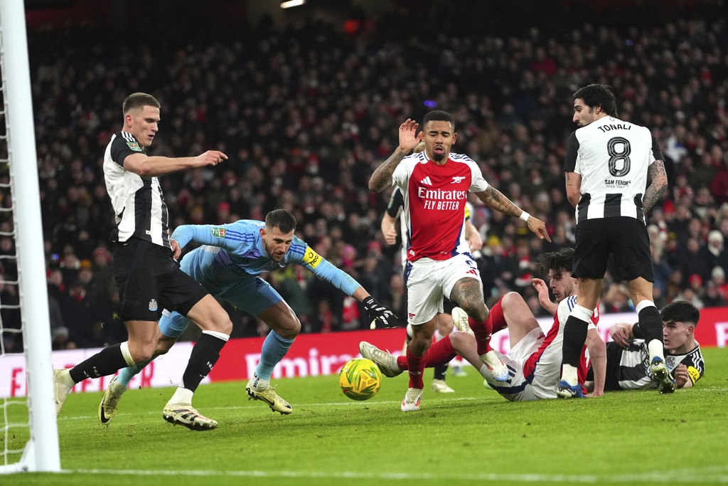 Newcastle’s Joelinton, left, fights for the ball with Arsenal’s William Saliba during the English League Cup semifinal first leg soccer match between Arsenal and Newcastle United at the Emirates stadium in London, Tuesday, Jan. 7, 2025. (AP Photo/Kirsty Wigglesworth)Arsenal’s Declan Rice, fights for the ball with Newcastle’s Dan Burn, center, during the English League Cup semifinal first leg soccer match between Arsenal and Newcastle United at the Emirates stadium in London, Tuesday, Jan. 7, 2025. (AP Photo/Kirsty Wigglesworth)Arsenal’s Gabriel Jesus, center, makes an attempt on goal during the English League Cup semifinal first leg soccer match between Arsenal and Newcastle United at the Emirates stadium in London, Tuesday, Jan. 7, 2025. (AP Photo/Kirsty Wigglesworth)Arsenal’s Kai Havertz, right, hangs on to the net after a missed opportunity on goal during the English League Cup semifinal first leg soccer match between Arsenal and Newcastle United at the Emirates stadium in London, Tuesday, Jan. 7, 2025. (AP Photo/Kirsty Wigglesworth)Newcastle’s Anthony Gordon, right, receives a yellow card during the English League Cup semifinal first leg soccer match between Arsenal and Newcastle United at the Emirates stadium in London, Tuesday, Jan. 7, 2025. (AP Photo/Kirsty Wigglesworth)Newcastle’s Alexander Isak celebrates after scoring the opening goal during the English League Cup semifinal first leg soccer match between Arsenal and Newcastle United at the Emirates stadium in London, Tuesday, Jan. 7, 2025. (AP Photo/Kirsty Wigglesworth)Newcastle’s Lewis Hall, right, falls as he fights for the ball with Arsenal’s Leandro Trossard during the English League Cup semifinal first leg soccer match between Arsenal and Newcastle United at the Emirates stadium in London, Tuesday, Jan. 7, 2025. (AP Photo/Kirsty Wigglesworth)Newcastle’s Alexander Isak, second right, celebrates with teammates after scoring the opening goal during the English League Cup semifinal first leg soccer match between Arsenal and Newcastle United at the Emirates stadium in London, Tuesday, Jan. 7, 2025. (AP Photo/Kirsty Wigglesworth)