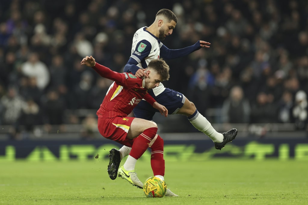 Tottenham’s Rodrigo Bentancur, top, duels for the ball with Liverpool’s Conor Bradley during the English League Cup semi final first leg soccer match between Tottenham and Liverpool, at the Tottenham Hotspur Stadium in London, Wednesday, Jan. 8, 2025. (AP Photo/Ian Walton)Liverpool’s Kostas Tsimikas, left, and Liverpool’s Virgil van Dijk, right, block a shot from Tottenham’s Brennan Johnson during the English League Cup semi final first leg soccer match between Tottenham and Liverpool, at the Tottenham Hotspur Stadium in London, Wednesday, Jan. 8, 2025. (AP Photo/Ian Walton)Tottenham’s Pedro Porro, left, duels for the ball with Liverpool’s Luis Diaz during the English League Cup semi final first leg soccer match between Tottenham and Liverpool, at the Tottenham Hotspur Stadium in London, Wednesday, Jan. 8, 2025. (AP Photo/Ian Walton)Tottenham’s head coach Ange Postecoglou celebrates with players at the end of the English League Cup semi final first leg soccer match between Tottenham and Liverpool, at the Tottenham Hotspur Stadium in London, Wednesday, Jan. 8, 2025. (AP Photo/Ian Walton)Tottenham’s Lucas Bergvall, right, shakes hands with Liverpool’s Virgil van Dijk at the end of the English League Cup semi final first leg soccer match between Tottenham and Liverpool, at the Tottenham Hotspur Stadium in London, Wednesday, Jan. 8, 2025. (AP Photo/Ian Walton)