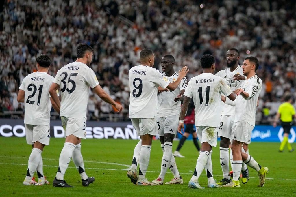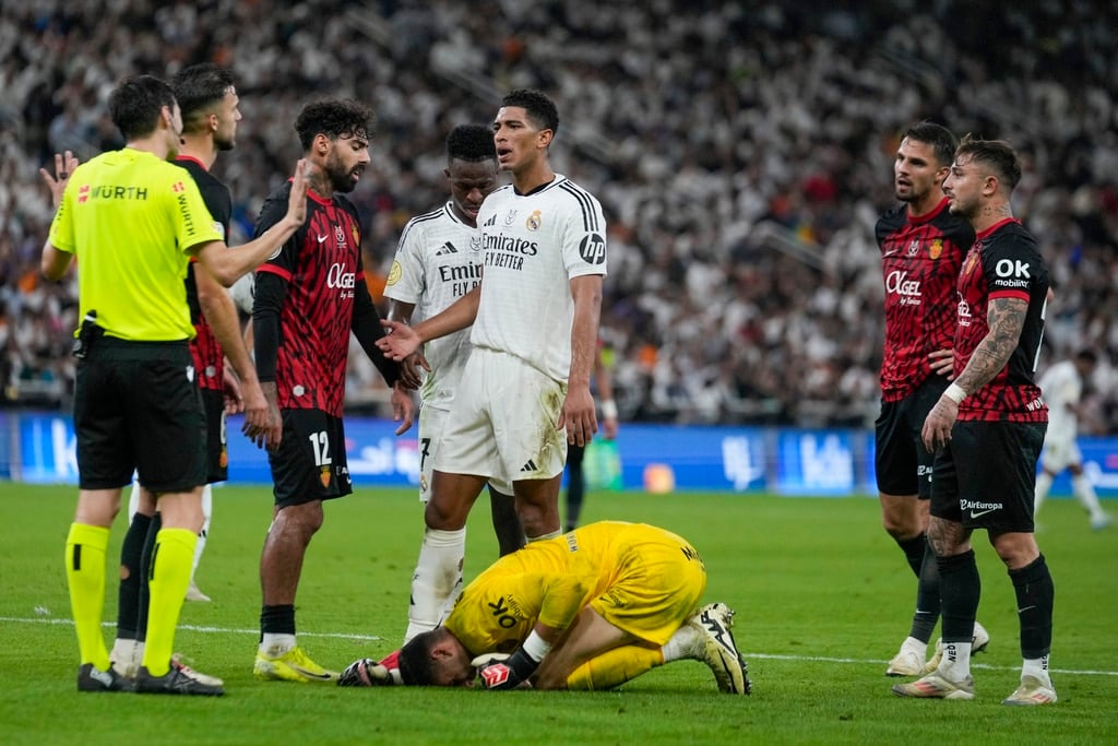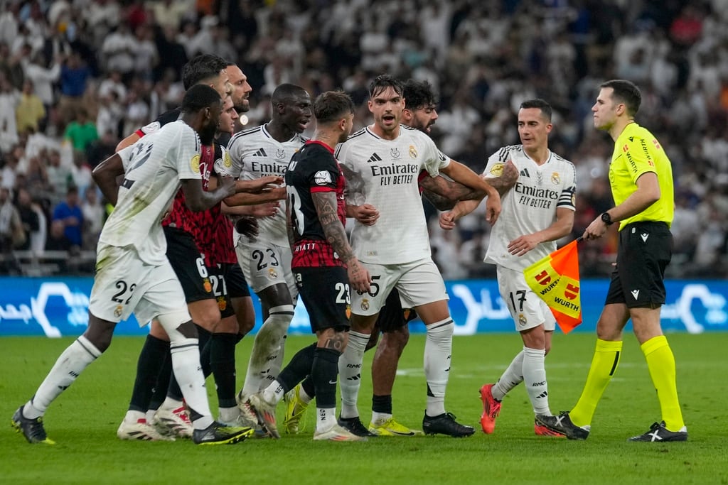 Real Madrid’s Jude Bellingham, centre right, celebrates after scoring his side’s opening goal during the Spanish Super Cup semifinal soccer match between Real Madrid and Mallorca at the King Abdullah Stadium in Jeddah, Saudi Arabia, Thursday, Jan. 9, 2025. (AP Photo/Altaf Qadri)Real Madrid’s Jude Bellingham, centre, celebrates after scoring his side’s opening goal during the Spanish Super Cup semifinal soccer match between Real Madrid and Mallorca at the King Abdullah Stadium in Jeddah, Saudi Arabia, Thursday, Jan. 9, 2025. (AP Photo/Altaf Qadri)Real Madrid’s Rodrygo is challenged by Mallorca’s Pablo Maffeo, right, during the Spanish Super Cup semifinal soccer match between Real Madrid and Mallorca at the King Abdullah Stadium in Jeddah, Saudi Arabia, Thursday, Jan. 9, 2025. (AP Photo/Altaf Qadri)Mallorca’s Johan Mojica is on the ground during the Spanish Super Cup semifinal soccer match between Real Madrid and Mallorca at the King Abdullah Stadium in Jeddah, Saudi Arabia, Thursday, Jan. 9, 2025. (AP Photo/Altaf Qadri)Players scuffle at the end of the Spanish Super Cup semifinal soccer match between Real Madrid and Mallorca at the King Abdullah Stadium in Jeddah, Saudi Arabia, Thursday, Jan. 9, 2025. (AP Photo/Altaf Qadri)Players scuffle at the end of the Spanish Super Cup semifinal soccer match between Real Madrid and Mallorca at the King Abdullah Stadium in Jeddah, Saudi Arabia, Thursday, Jan. 9, 2025. (AP Photo/Altaf Qadri)Real Madrid players celebrate after Mallorca’s Martin Valjent scored an own goal during the Spanish Super Cup semifinal soccer match between Real Madrid and Mallorca at the King Abdullah Stadium in Jeddah, Saudi Arabia, Thursday, Jan. 9, 2025. (AP Photo/Altaf Qadri)Players argue as Mallorca’s goalkeeper Dominik Greif grimaces on the ground during the Spanish Super Cup semifinal soccer match between Real Madrid and Mallorca at the King Abdullah Stadium in Jeddah, Saudi Arabia, Thursday, Jan. 9, 2025. (AP Photo/Altaf Qadri)Real Madrid’s Vinicius Junior is in action during the Spanish Super Cup semifinal soccer match between Real Madrid and Mallorca at the King Abdullah Stadium in Jeddah, Saudi Arabia, Thursday, Jan. 9, 2025. (AP Photo/Altaf Qadri)
