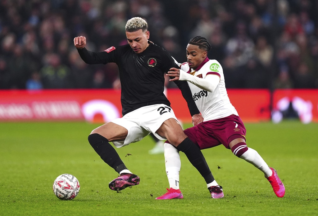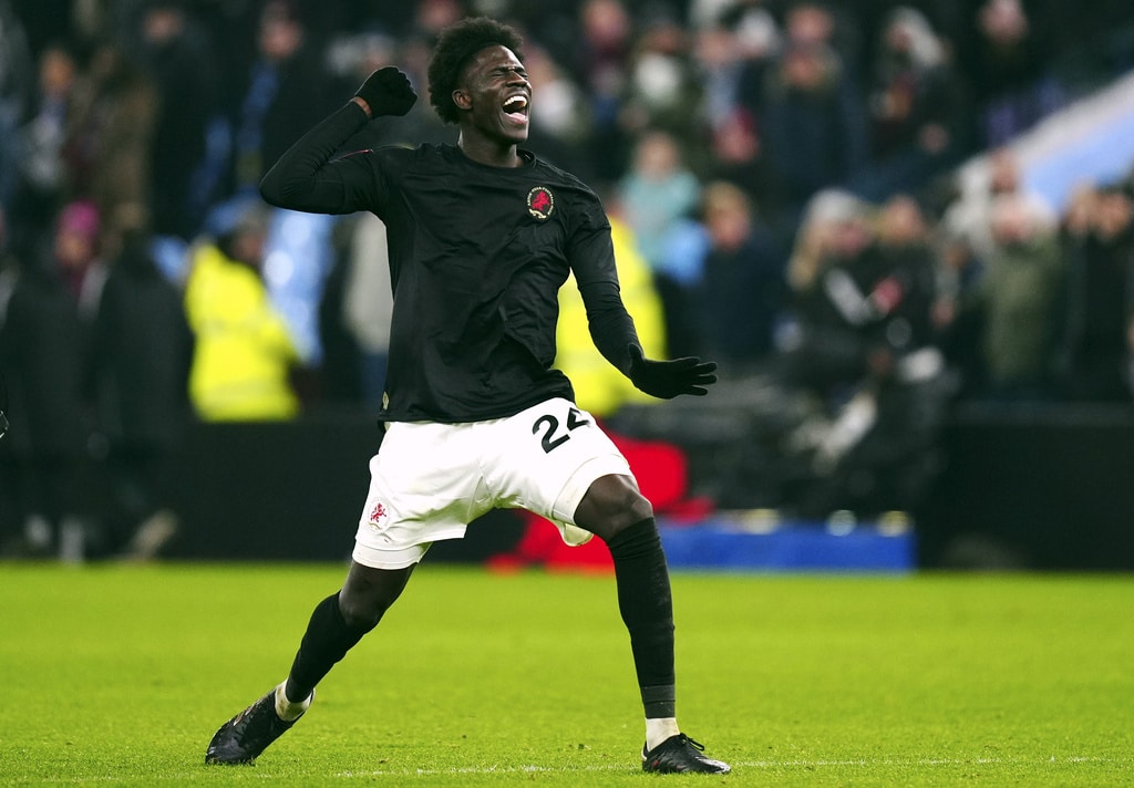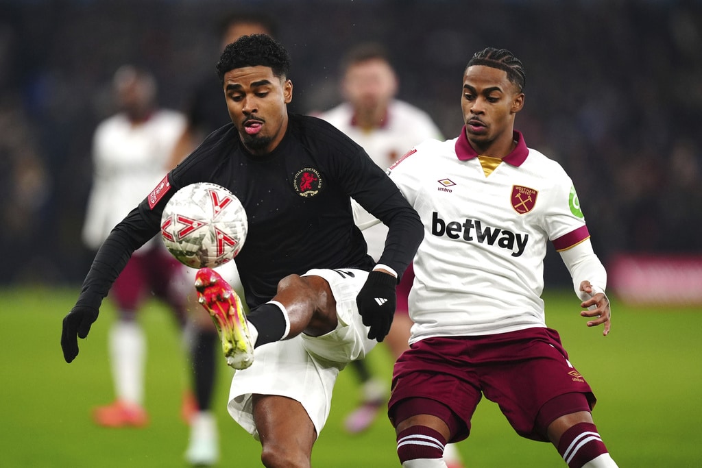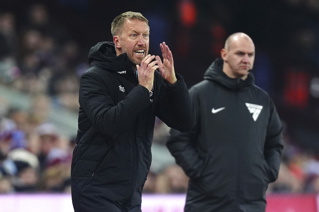 Aston Villa’s Ian Maatsen, left, and West Ham United’s Crysencio Summerville battle for the ball during the English FA Cup third round soccer match between Aston Villa and West Ham United at Villa Park, Birmingham, England, Friday Jan. 10, 2025. (Mike Egerton/PA via AP)Aston Villa’s Amadou Onana celebrates in front of fans after the final whistle of a English FA Cup third round soccer match against West Ham United at Villa Park in Birmingham, England, Friday, Jan. 10, 2025. (Mike Egerton/PA via AP)Aston Villa’s Morgan Rogers, left, and West Ham United’s Crysencio Summerville battle for the ball during the English FA Cup third round soccer match between Aston Villa and West Ham United at Villa Park, Birmingham, England, Friday Jan. 10, 2025. (Mike Egerton/PA via AP)West Ham United manager Graham Potter, left, reacts during the English FA Cup third round soccer match against Aston Villa at Villa Park in Birmingham, England, Friday, Jan. 10, 2025. (Mike Egerton/PA via AP)