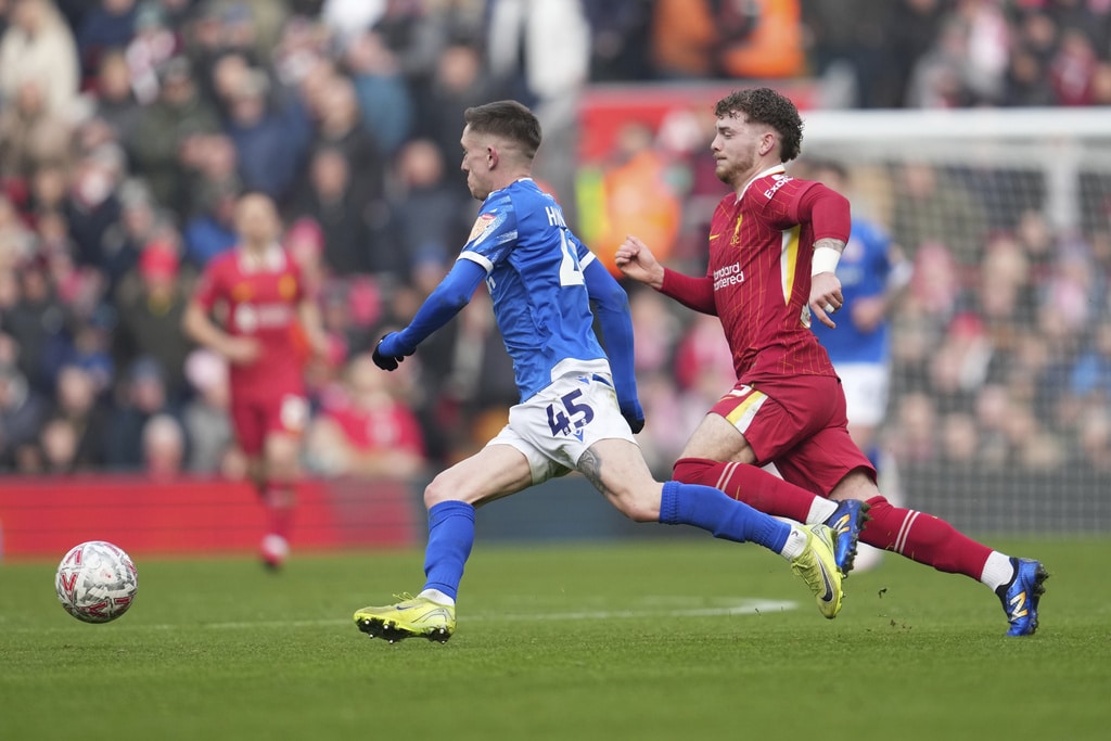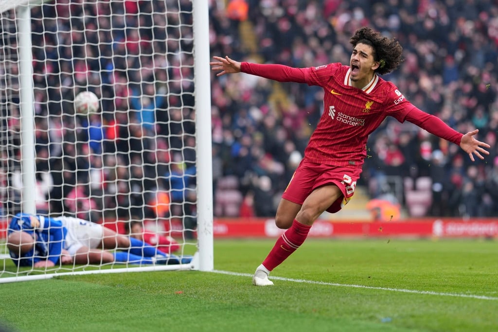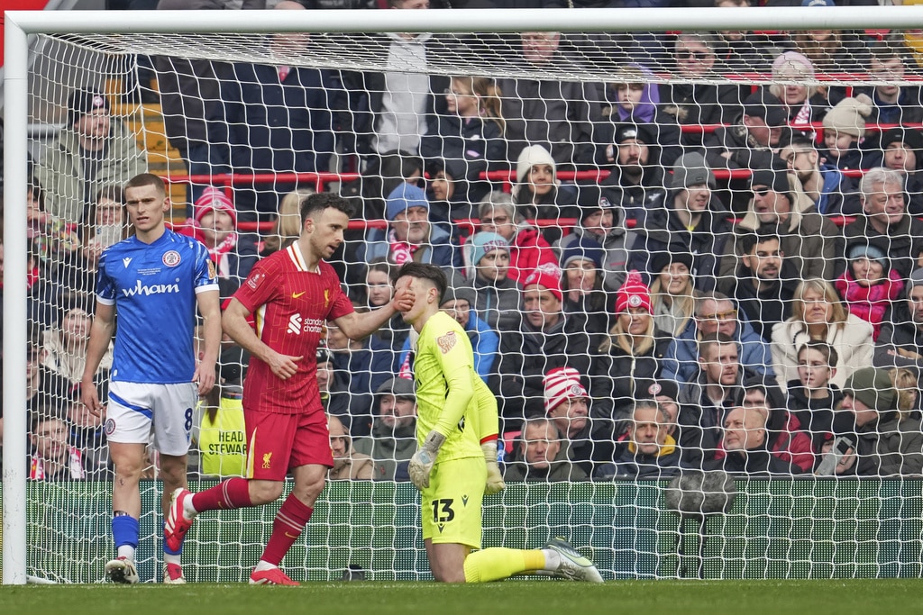 Liverpool’s Diogo Jota, center, celebrates after scoring the opening goal during the FA Cup soccer match between Liverpool and Accrington Stanley at the Anfield stadium in Liverpool, England, Saturday, Jan. 11, 2025. (AP Photo/Jon Super)Liverpool’s Jayden Danns, right, celebrates with teammates after scoring his side’s third goal during the FA Cup soccer match between Liverpool and Accrington Stanley at the Anfield stadium in Liverpool, England, Saturday, Jan. 11, 2025. (AP Photo/Jon Super)Liverpool’s Jayden Danns celebrates after scoring his side’s third goal during the FA Cup soccer match between Liverpool and Accrington Stanley at the Anfield stadium in Liverpool, England, Saturday, Jan. 11, 2025. (AP Photo/Jon Super)Liverpool’s Federico Chiesa, left, and Accrington’s Ben Woods vie for the ball during the FA Cup soccer match between Liverpool and Accrington Stanley at the Anfield stadium in Liverpool, England, Saturday, Jan. 11, 2025. (AP Photo/Jon Super)Liverpool’s Darwin Nunez runs with the ball during the FA Cup soccer match between Liverpool and Accrington Stanley at the Anfield stadium in Liverpool, England, Saturday, Jan. 11, 2025. (AP Photo/Jon Super)Accrington’s Zach Awe falls as he tries to stop Liverpool’s Trent Alexander-Arnold during the FA Cup soccer match between Liverpool and Accrington Stanley at the Anfield stadium in Liverpool, England, Saturday, Jan. 11, 2025. (AP Photo/Jon Super)Accrington’s Ashley Hunter, left, and Liverpool’s Harvey Elliott vie for the ball during the FA Cup soccer match between Liverpool and Accrington Stanley at the Anfield stadium in Liverpool, England, Saturday, Jan. 11, 2025. (AP Photo/Jon Super)