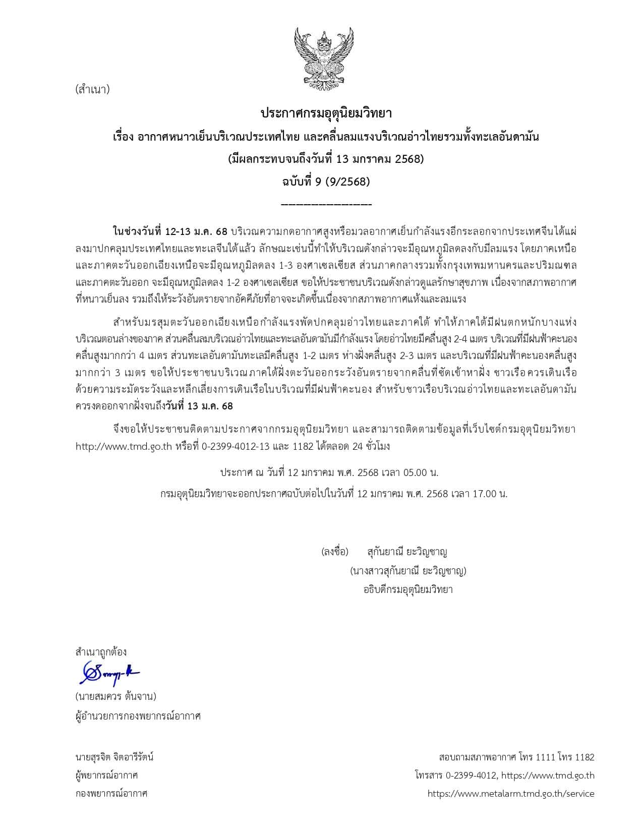 กรมอุตุนิยมวิทยาจะออกประกาศฉบับต่อไปในวันที่ 12 มกราคม พ.ศ. 2568 เวลา 17.00 น.