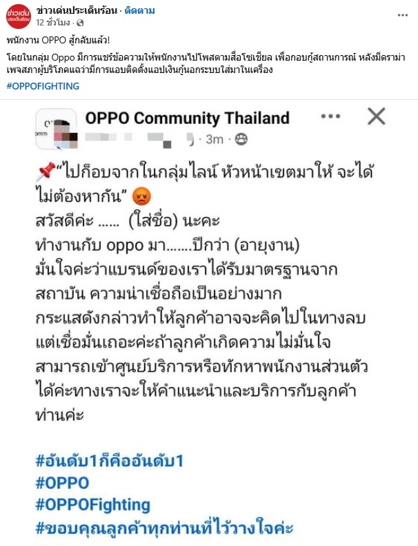 ต่อมาทางเพจ ข่าวเด่นประเด็นร้อน ก็ออกมาโพสต์ภาพที่มาของ #OPPOfighting ซึ่งมีคนนำมาโพสต์เอาไว้ในกลุ่มเฟซบุ๊ก OPPO Community Thailand เผยให้เห็นข้อความที่ถูกจัดวางมาให้แล้ว แล้วนำส่งให้กับพนักงานต่อกันเป็นทอด ๆ ให้ก็อปปี้แล้วใส่ชื่อกับอายุงานของแต่ละคนโพสต์ในเฟซบุ๊กส่วนตัว เพื่อปลุกปั่นกระแส หลังบริษัทเจอดราม่าครั้งใหญ่