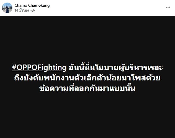 ล่าสุดดูเหมือนว่าเรื่องจะยิ่งเริ่มบานปลายขึ้นทุกที เนื่องจากเมื่อวานนี้ (12 ม.ค. 68) จู่ ๆ ก็มี #OPPOfighting เกิดขึ้นมาในเฟซบุ๊ก ซึ่งโพสต์โดยกลุ่มพนักงานทั้งเก่าและใหม่ที่ทำงานกับบริษัท OPPO ออกมาโพสต์ข้อความในรูปแบบเดียวกัน แค่เปลี่ยนชื่อตัวเอง พร้อมติดแฮชแท็ก #OPPOfighting