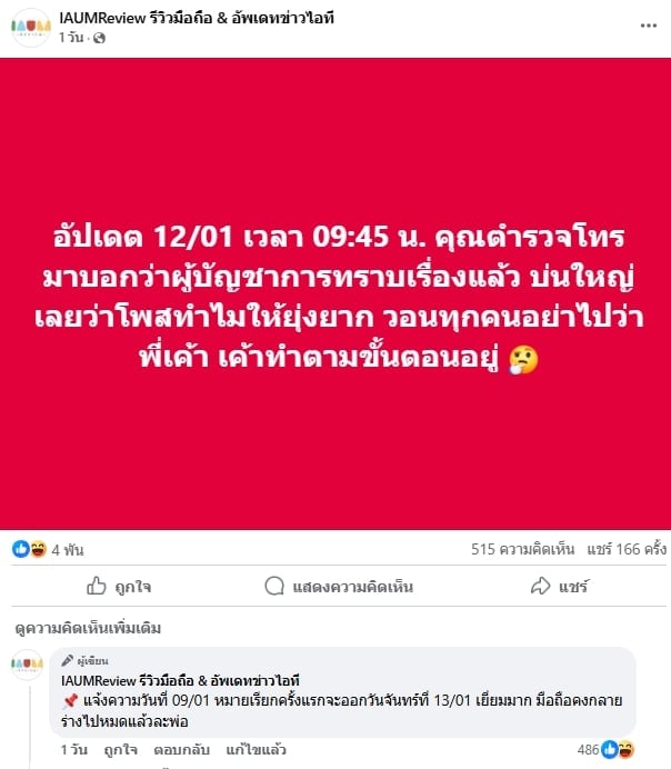 ทั้งนี้ทางเพจ IAUMReview รีวิวมือถือ & อัพเดทข่าวไอที ก็ยังได้อัปเดตเพิ่มเติมในคอมเมนต์ว่า “แจ้งความวันที่ 09/01 หมายเรียกครั้งแรกจะออกวันจันทร์ที่ 13/01 เยี่ยมมาก มือถือคงกลายร่างไปหมดแล้วละพ่อ” ด้านแฟนคลับต่างก็เข้ามาแสดงความคิดเห็นว่าให้ทางคุณอุ้มเอาเรื่องให้ถึงที่สุด ถ้าเรื่องไม่ถูกโพสต์ลงสื่อแล้วมีคนเอาไปทำข่าว เรื่องก็คงจะไม่คืบหน้า