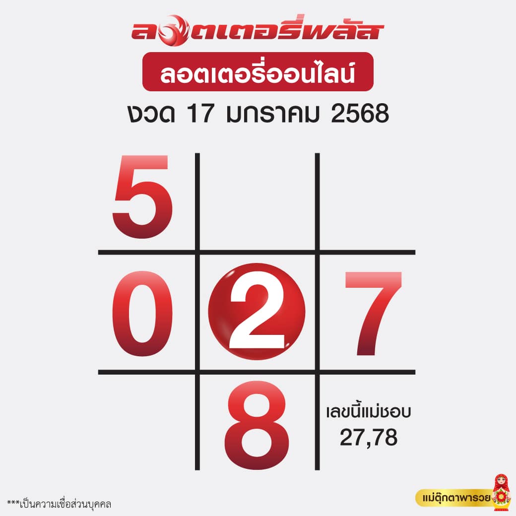 - เลขท้าย 2 ตัว : 02 – 05 – 07 – 08 – 25 – 27 – 28 – 57 – 58 – 78
