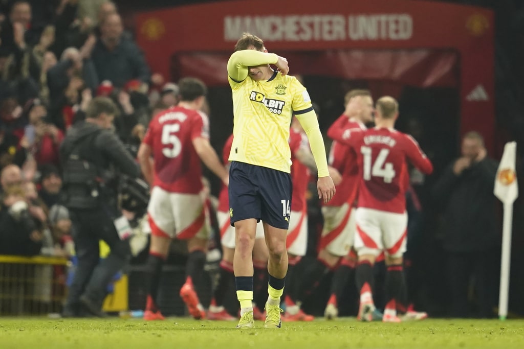 Southampton’s James Bree reacts after Manchester United’s Amad Diallo scored his side’s third goal during the English Premier League soccer match between Manchester United and Southampton at the Old Trafford stadium in Manchester, England, Thursday, Jan. 16, 2025. (AP Photo/Dave Thompson)