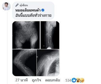 ขณะเดียวกัน หมอแล็บแพนด้า ก็ได้ออกมาโพสต์เตือนภัยคนที่ชอบกินซอยจุ๊ ซกเล็ก เช่นกันหลังจากได้ชมคลิปคีบพยาธิจากเพจอีซ้อจบ พร้อมยังแปะรูปเอกซเรย์คนไข้ตัวอย่างที่มีพยาธิฝังตัวอยู่ทั่วทั้งร่างกาย โดยระบุว่า
