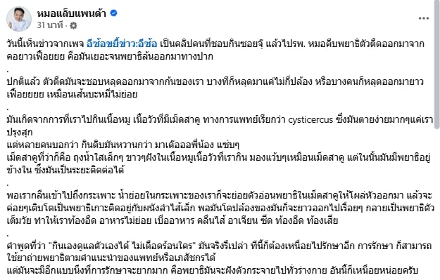 “วันนี้เห็นข่าวจากเพจ อีซ้อขยี้ข่าว:อีซ้อ เป็นคลิปคนที่ชอบกินซอยจุ๊ แล้วไปรพ. หมอคีบพยาธิตัวตืดออกมาจากคอยาวเฟื้อยยย คือมันเยอะจนพยาธิล้นออกมาทางปาก