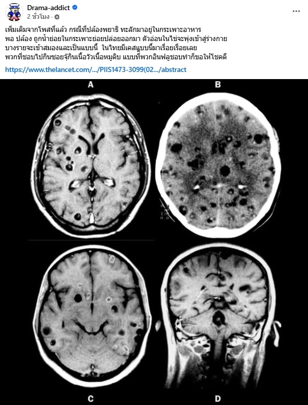 เพจดังเปิดภาพสยอง ผลแสกนพบ พยาธิฝังตัวกระจายทั่วสมอง อุทาหรณ์ความเป็นความตายจากเมนูแซ่บ ๆ อย่าง ซอยจุ๊, ลาบก้อย และซกเล็ก