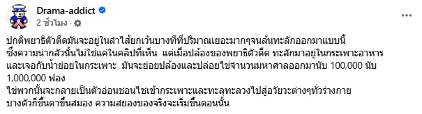 อีกทั้งก่อนหน้านี้ Drama-addict ได้แชร์โพสต์ของหมอแล็บแพนด้า พร้อมระบุข้อความให้ความรู้เพิ่มเติมว่า “ปกติพยาธิตัวตืดมันจะอยู่ในลำไส้ยกเว้นบางทีที่ปริมาณเยอะมากๆจนล้นทะลักออกมาแบบนี้ ซึ่งความน่ากลัวนั้นไม่ใช่แค่ในคลิปที่เห็น แต่เมื่อปล้องของพยาธิตัวตืด ทะลักมาอยู่ในกระเพาะอาหาร และเจอกับน้ำย่อยในกระเพาะ มันจะย่อยปล้องและปล่อยไข่จำนวนมหาศาลออกมานับ 100,000 นับ 1,000,000 ฟอง ไข่พวกนั้นจะกลายเป็นตัวอ่อนชอนไชเข้ากระเพาะและทะลุทะลวงไปสู่อวัยวะต่างๆทั่วร่างกาย บางตัวก็ขึ้นตาขึ้นสมอง ความสยองของจริงจะเริ่มขึ้นตอนนั้น“