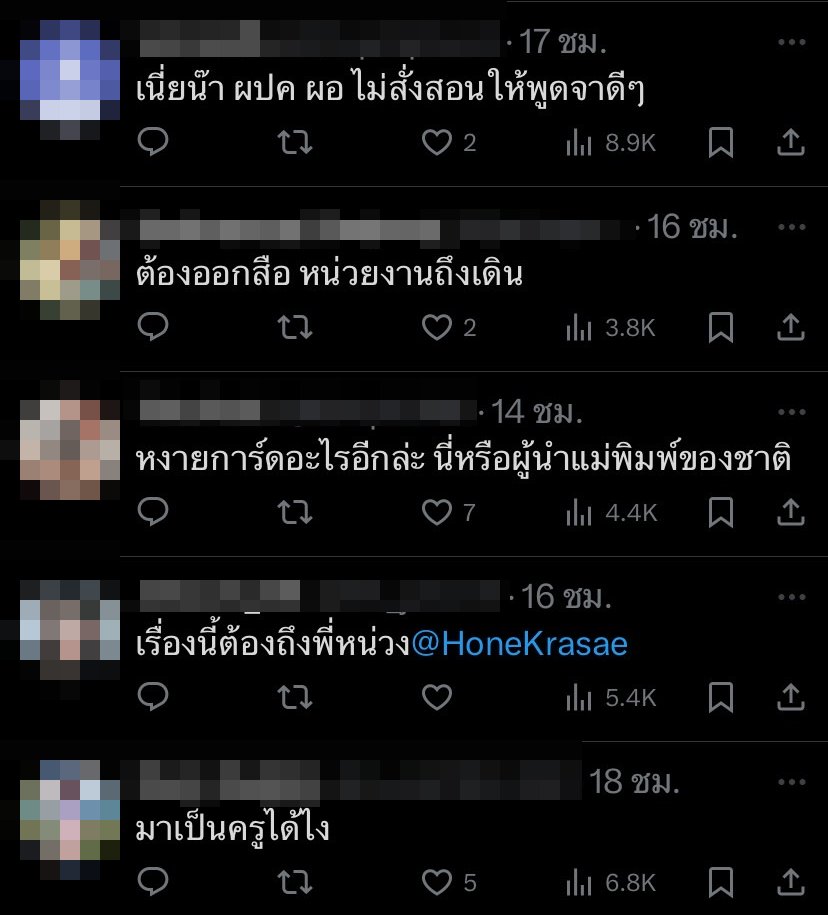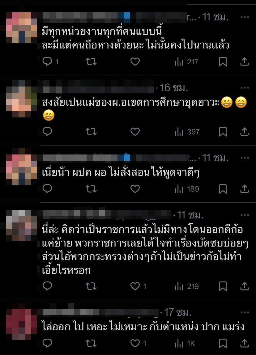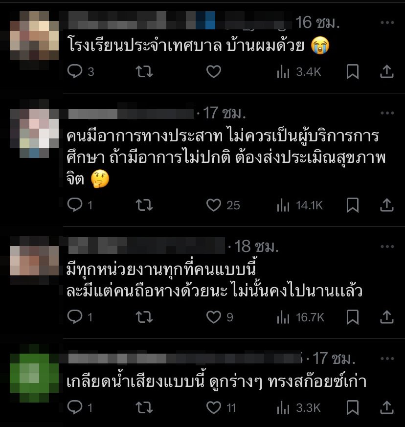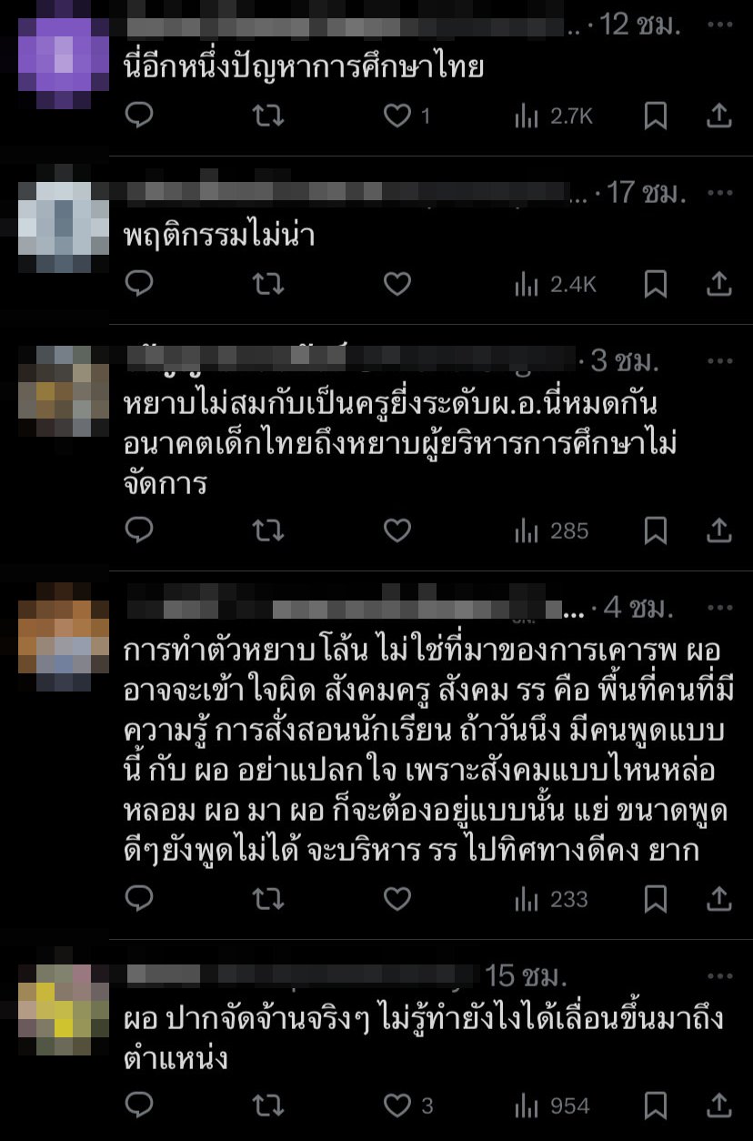 ขณะที่ชาวเน็ตได้เห็นเรื่องราวดังกล่าวต่างก็เข้ามาแสดงความคิดเห็นเป็นจำนวนมาก โดยเห็นพ้องต้องกันว่า พฤติกรรมแบบนี้ไม่ควรมาเป็นครูด้วยซ้ำ ทำไมถึงได้เลื่อนขั้นขึ้นไปเป็นถึงผอ.โรงเรียน จับฉลากได้มา หรือเพราะมีแบล็คดีกันแน่? จะเรียกตัวเองว่าเป็นแม่พิมพ์ของชาติได้อย่างไร หากยังทำตัวแบบนี้ เรื่องออกสื่อแล้วเจ้าหน้าที่ที่เกี่ยวข้องคงจะต้องเริ่มทำงานกันหน่อยแล้ว
