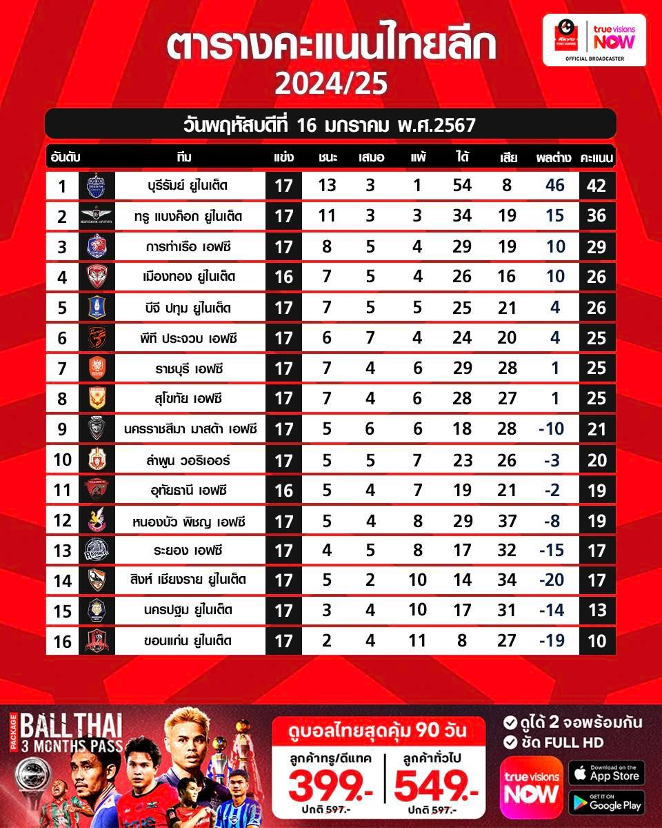 >> ตารางคะแนน ไทยลีก 2024/25 อัปเดตล่าสุด เช็คคะแนนทุกทีมได้ที่นี่ <<
