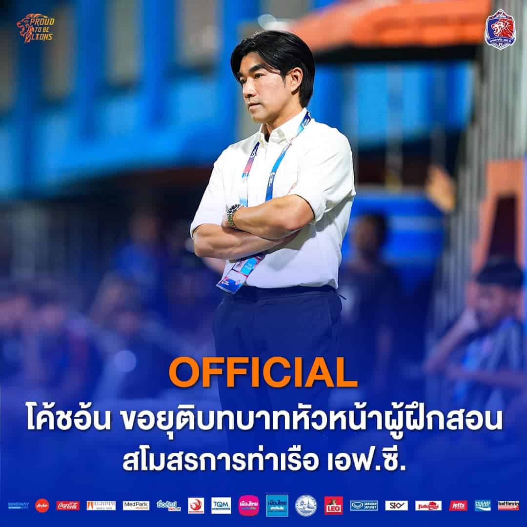 โค้ชอ้น กล่าวว่า “วันนี้ผมอยากถือโอกาสเข้ามาลา ท่านประธานสโมสร (เฉลิมโชค ล่ำซำ) และ ผู้บริหารด้วยตนเอง เพื่อแสดงความรับผิดชอบ กับผลงานที่เกิดขึ้น ผมขอบคุณผู้บริหารสโมสรฯ ที่ให้การสนับสนุนผมด้วยดีมาโดยตลอด แต่จากผลงานที่ไม่เป็นไปตามเป้า”