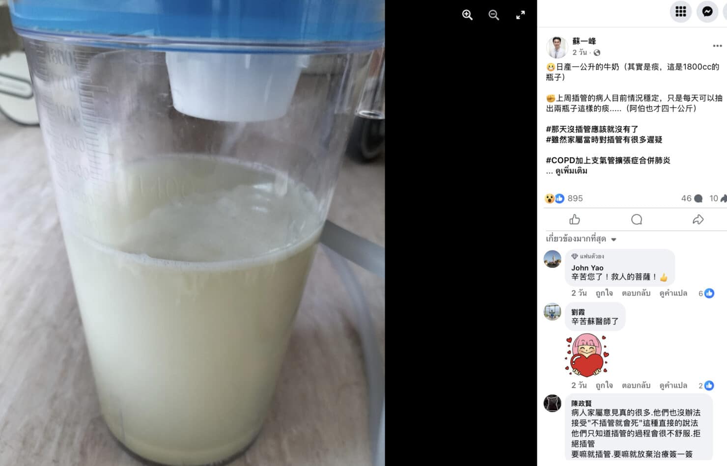 แพทย์ทรวงอกชาวไต้หวัน ซู อี้เฟิง ได้แชร์ภาพผ่านเฟซบุ๊ก 蘇一峰 กรณีผู้ป่วยชายรายหนึ่งในไต้หวัน ป่วยด้วยโรคปอดอุดกั้นเรื้อรัง (COPD) และมีภาวะหลอดลมโป่งพองร่วมกับปอดอักเสบ ต้องใส่ท่อช่วยหายใจ (ใส่ท่อหรือ “ใส่ท่อ” ในที่นี้หมายถึงการใช้เครื่องช่วยหายใจและสอดท่อเข้าหลอดลม) เมื่อสัปดาห์ที่ผ่านมา แพทย์เผยว่าผู้ป่วยรายนี้สามารถดูดเสมหะออกจากปอดได้มากถึงวันละ 1 ลิตร ลักษณะคล้ายน้ำนม แสดงถึงความรุนแรงของโรคที่อาจทำให้ผู้ป่วย “จมน้ำในเสมหะของตนเอง” จนเสียชีวิตได้เลยทีเดียว