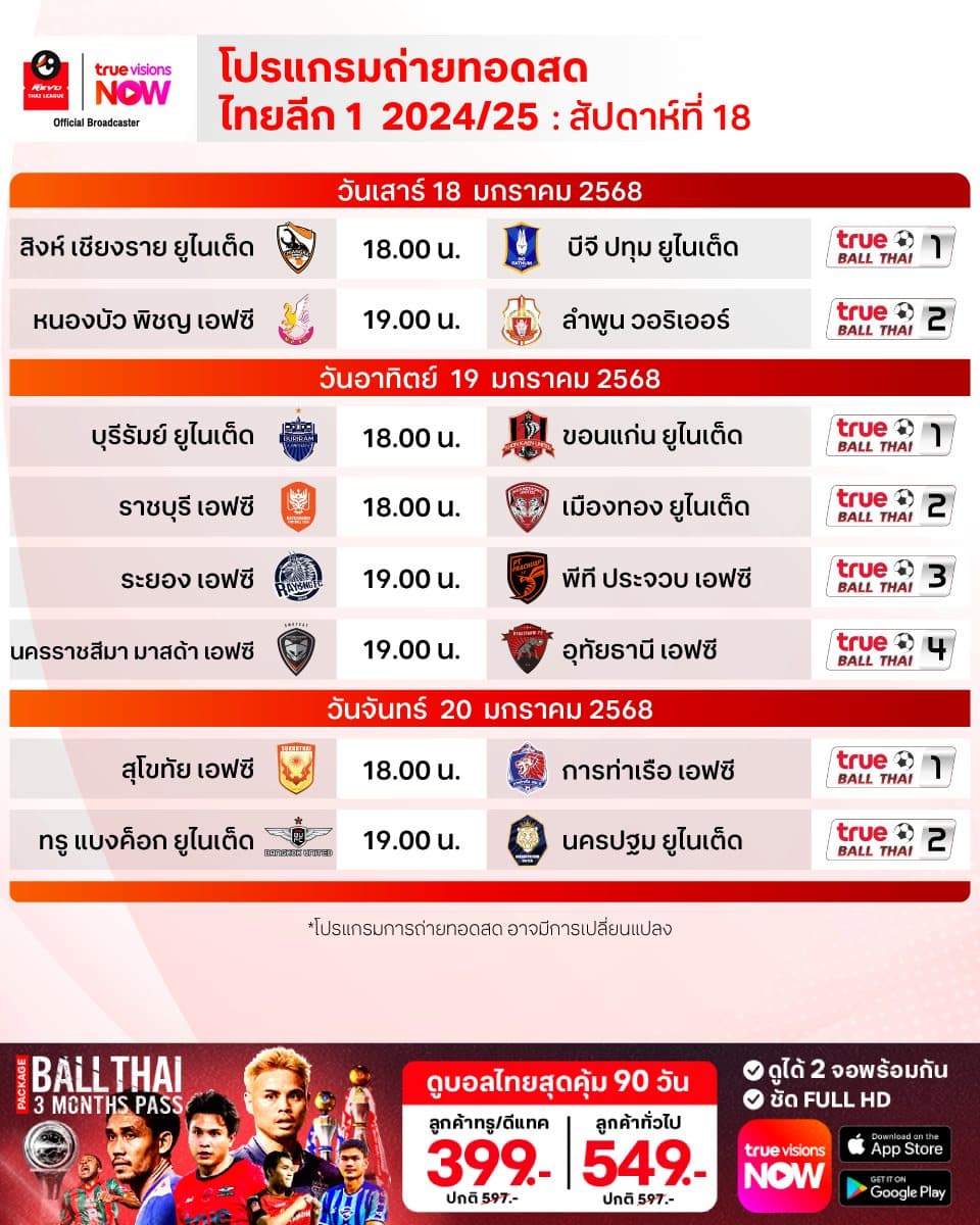 ตารางแข่งขัน รีโว่ 2024/25 ไทยลีก โปรแกรมฟุตบอลไทยลีก นัดที่ 18 ทุกคู่ถ่ายทอดสดทาง AIS Play และ True Ball Thai