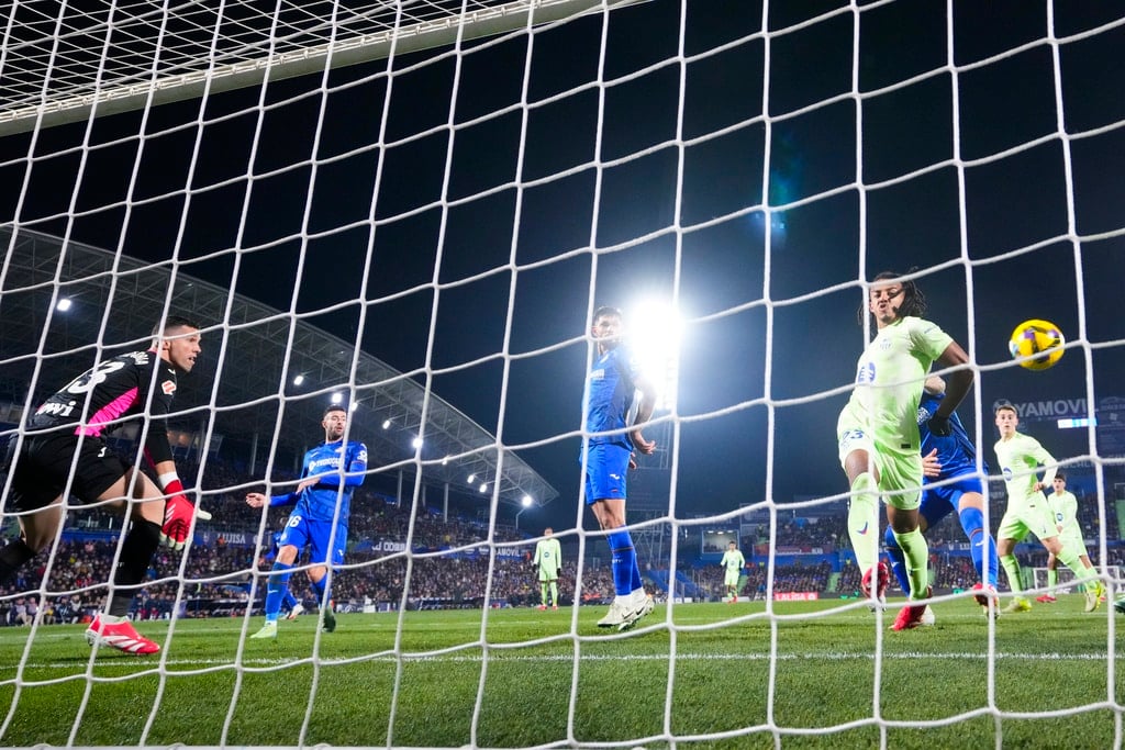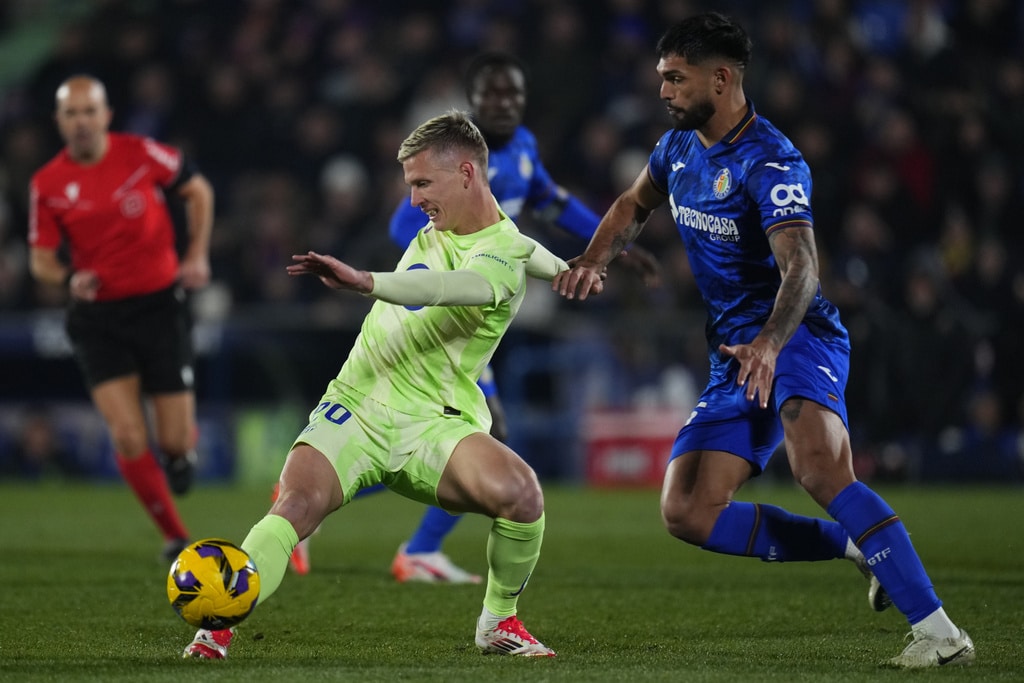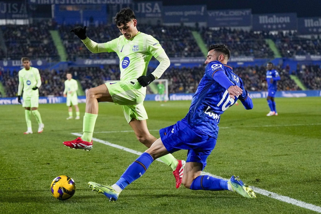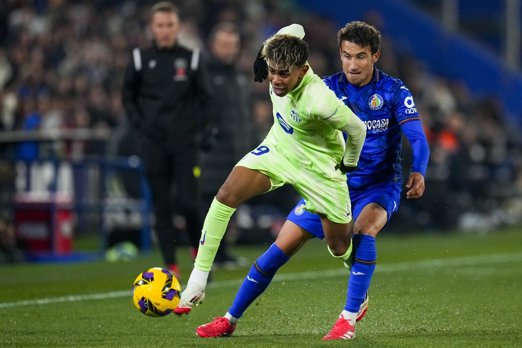 Barcelona’s Lamine Yamal, left, and Getafe’s Luis Milla battle for the ball during a Spanish La Liga soccer match at the Coliseum Alfonso Perez stadium in Getafe, Spain, Saturday, Jan. 18, 2025. (AP Photo/Manu Fernandez)Barcelona’s Dani Olmo, left, and Getafe’s Omar Alderete fight for the ball during a Spanish La Liga soccer match at the Coliseum Alfonso Perez stadium in Getafe, Spain, Saturday, Jan. 18, 2025. (AP Photo/Manu Fernandez)Barcelona’s Jules Kounde, right, scores the opening goal against Getafe during a Spanish La Liga soccer match at the Coliseum Alfonso Perez stadium in Getafe, Spain, Saturday, Jan. 18, 2025. (AP Photo/Manu Fernandez)Barcelona’s Lamine Yamal, center, reacts after Getafe’s goal during a Spanish La Liga soccer match at the Coliseum Alfonso Perez stadium in Getafe, Spain, Saturday, Jan. 18, 2025. (AP Photo/Manu Fernandez)Barcelona’s Lamine Yamal, front, controls a ball chased by Getafe’s Luis Milla during a Spanish La Liga soccer match at the Coliseum Alfonso Perez stadium in Getafe, Spain, Saturday, Jan. 18, 2025. (AP Photo/Manu Fernandez)Barcelona’s Pedri, left, and Getafe’s Diego Rico battle for the ball during a Spanish La Liga soccer match at the Coliseum Alfonso Perez stadium in Getafe, Spain, Saturday, Jan. 18, 2025. (AP Photo/Manu Fernandez)Barcelona’s Jules Kounde, center, celebrates after scoring the opening goal against Getafe during a Spanish La Liga soccer match at the Coliseum Alfonso Perez stadium in Getafe, Spain, Saturday, Jan. 18, 2025. (AP Photo/Manu Fernandez)