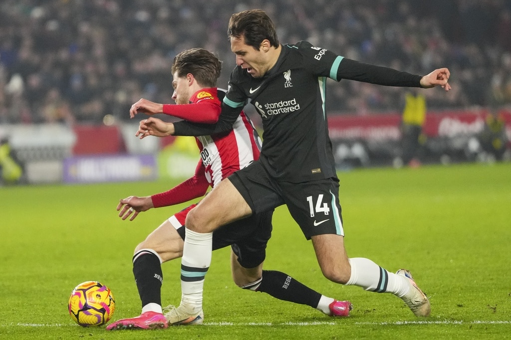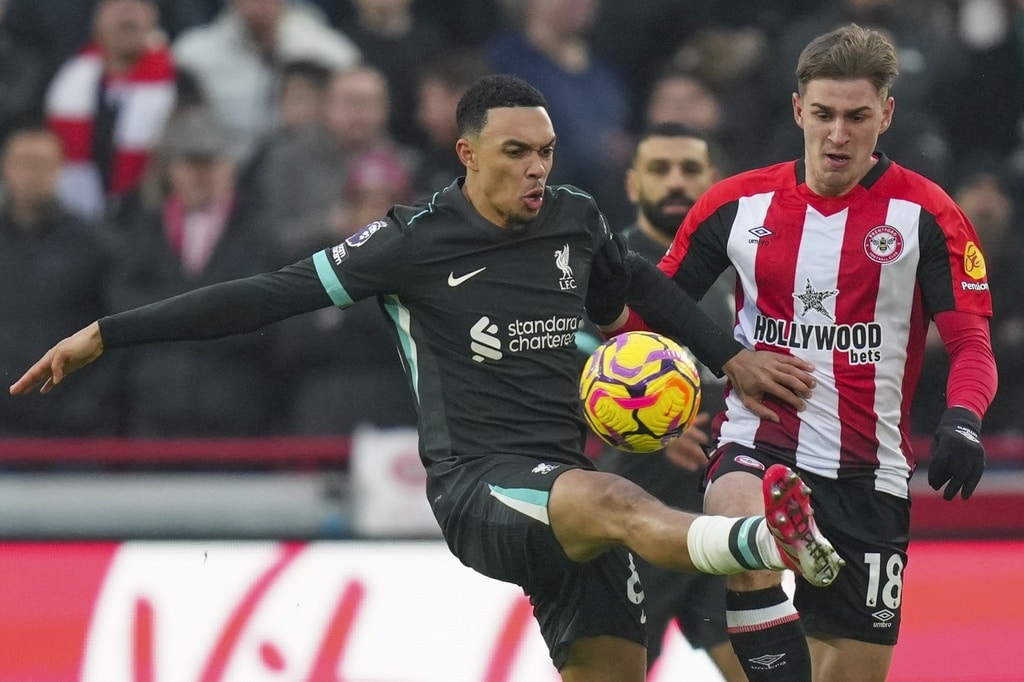 Liverpool’s Trent Alexander-Arnold, left, is challenged by Brentford’s Yehor Yarmolyuk during the English Premier League soccer match between Brentford and Liverpool at the GTech Community Stadium in London, Saturday, Jan. 18, 2025. (AP Photo/Kirsty Wigglesworth)Liverpool’s Darwin Nunez celebrates after scoring his side’s second goal during the English Premier League soccer match between Brentford and Liverpool at the GTech Community Stadium in London, Saturday, Jan. 18, 2025. (AP Photo/Kirsty Wigglesworth)Liverpool’s Darwin Nunez celebrates after scoring his side’s second goal during the English Premier League soccer match between Brentford and Liverpool at the GTech Community Stadium in London, Saturday, Jan. 18, 2025. (AP Photo/Kirsty Wigglesworth)Liverpool’s Federico Chiesa and Brentford’s Mathias Jensen, left, battle for the ball during the English Premier League soccer match between Brentford and Liverpool at the GTech Community Stadium in London, Saturday, Jan. 18, 2025. (AP Photo/Kirsty Wigglesworth)Liverpool’s Luis Diaz is challenged by Brentford’s goalkeeper Mark Flekken during the English Premier League soccer match between Brentford and Liverpool at the GTech Community Stadium in London, Saturday, Jan. 18, 2025. (AP Photo/Kirsty Wigglesworth)Brentford’s Nathan Collins, center, heads the ball during the English Premier League soccer match between Brentford and Liverpool at the GTech Community Stadium in London, Saturday, Jan. 18, 2025. (AP Photo/Kirsty Wigglesworth)Liverpool’s Dominik Szoboszlai, right, challenges Brentford’s Vitaly Janelt during the English Premier League soccer match between Brentford and Liverpool at the GTech Community Stadium in London, Saturday, Jan. 18, 2025. (AP Photo/Kirsty Wigglesworth)