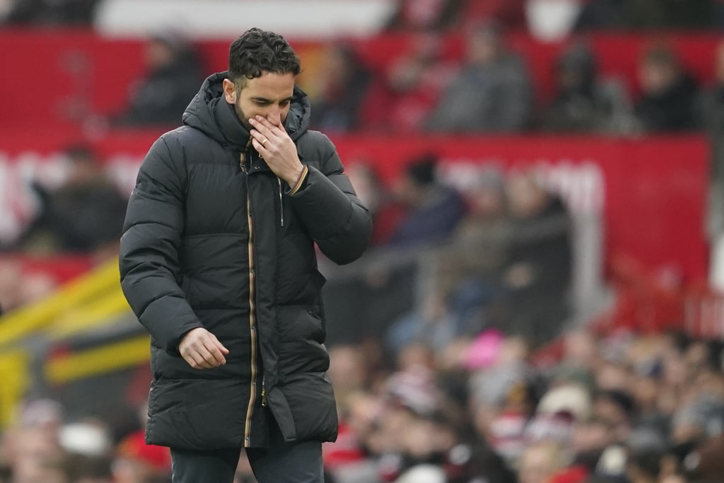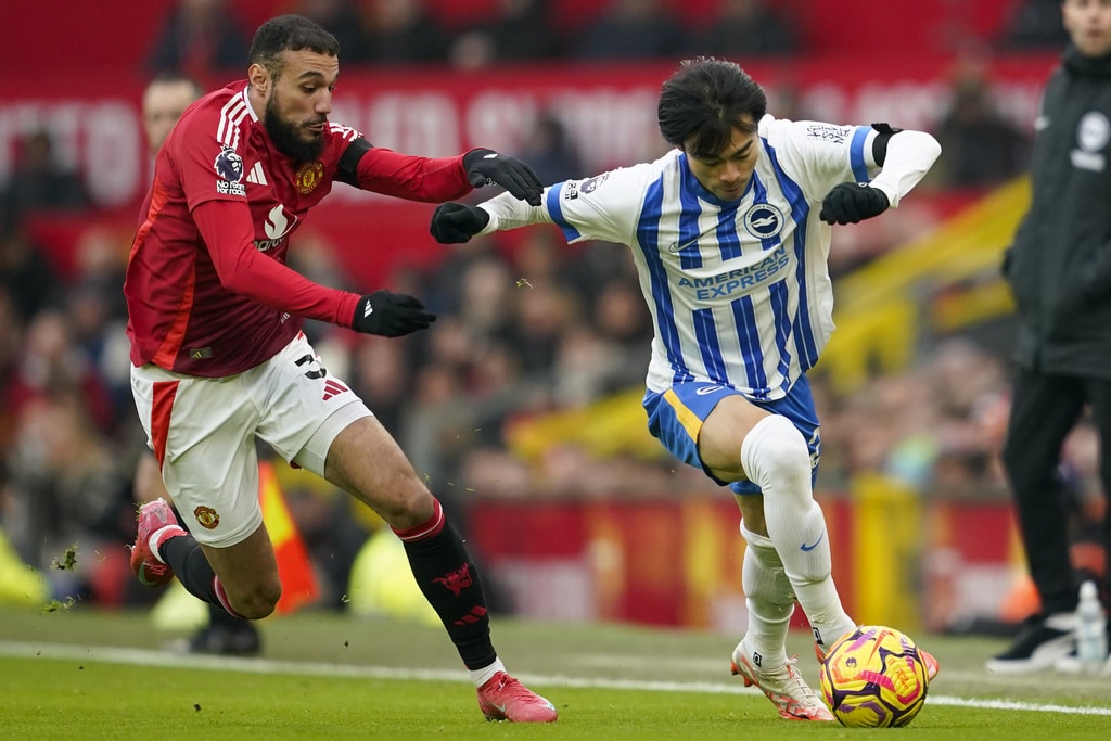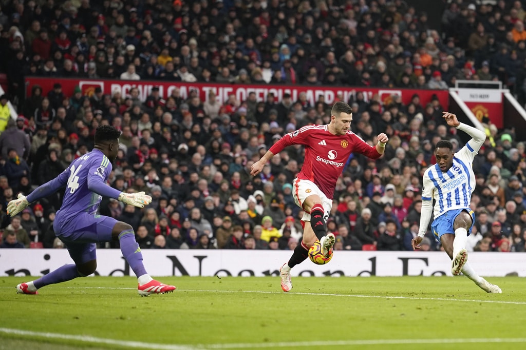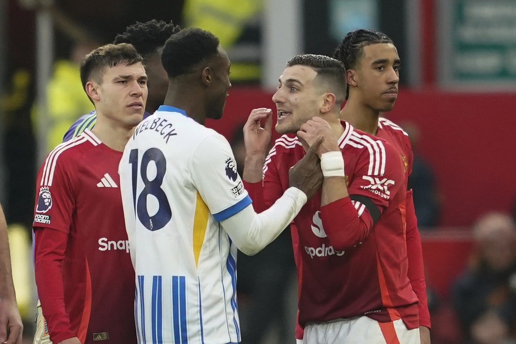 Manchester United’s Noussair Mazraoui, left, and Brighton’s Kaoru Mitoma fight for the ball during the English Premier League soccer match between Manchester United and Brighton and Hove Albion, at the Old Trafford stadium in Manchester, England, Sunday, Jan. 19, 2025. (AP Photo/Dave Thompson)Manchester United’s Matthijs de Ligt, second from right, comforts Manchester United’s goalkeeper Andre Onana after Brighton scored itss third during the English Premier League soccer match between Manchester United and Brighton and Hove Albion, at the Old Trafford stadium in Manchester, England, Sunday, Jan. 19, 2025. (AP Photo/Dave Thompson)Brighton’s Yankuba Minteh, right, fights for the ball with Manchester United’s Alejandro Garnacho, left, and Joshua Zirkzee during the English Premier League soccer match between Manchester United and Brighton and Hove Albion, at the Old Trafford stadium in Manchester, England, Sunday, Jan. 19, 2025. (AP Photo/Dave Thompson)Brighton’s Danny Welbeck, left, and Manchester United’s Diogo Dalot argue during a VAR decision during the English Premier League soccer match between Manchester United and Brighton and Hove Albion, at the Old Trafford stadium in Manchester, England, Sunday, Jan. 19, 2025. (AP Photo/Dave Thompson)Brighton’s Danny Welbeck, right, has a shot blocked by Manchester United’s Diogo Dalot during the English Premier League soccer match between Manchester United and Brighton and Hove Albion, at the Old Trafford stadium in Manchester, England, Sunday, Jan. 19, 2025. (AP Photo/Dave Thompson)Manchester United’s head coach Erik ten Hag follows the game during the English Premier League soccer match between Manchester United and Brighton and Hove Albion, at the Old Trafford stadium in Manchester, England, Sunday, Jan. 19, 2025. (AP Photo/Dave Thompson)Manchester United’s Bruno Fernandes, second from right, celebrates with his teammates after he scored his side’s first goal during the English Premier League soccer match between Manchester United and Brighton and Hove Albion, at the Old Trafford stadium in Manchester, England, Sunday, Jan. 19, 2025. (AP Photo/Dave Thompson)