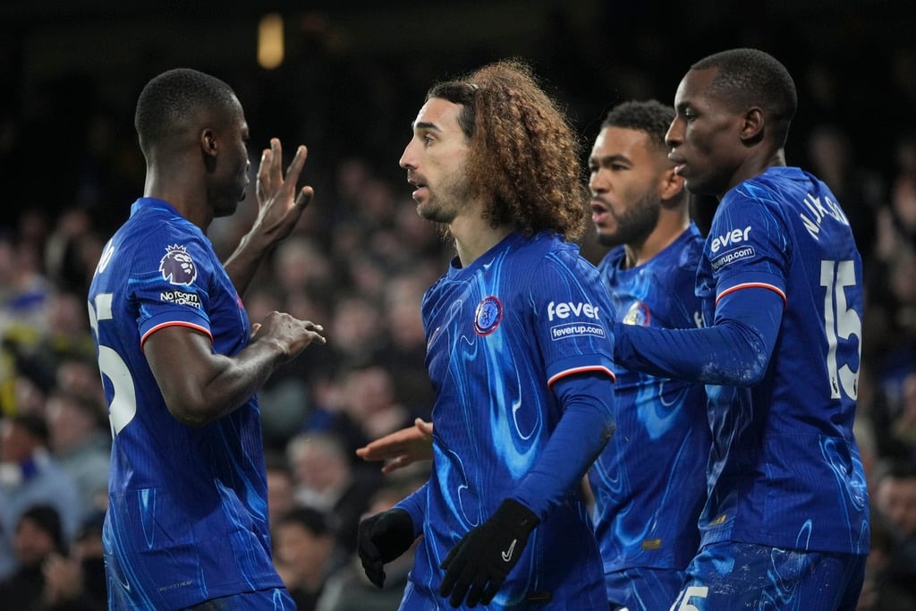 Chelsea’s Marc Cucurella, right, celebrates with teammates after scoring his side’s second goal during the English Premier League soccer match between Chelsea and Wolverhampton at Stamford Bridge stadium in London, Monday, Jan. 20, 2025. (AP Photo/Kin Cheung)