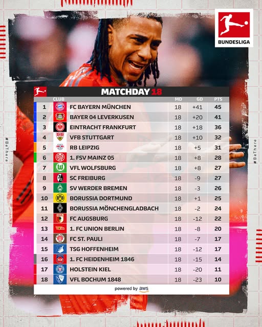 อันดับ ตารางคะแนน บุนเดสลีกา เยอรมัน 2024/25 หลังจบแมตซ์เดย์ที่ 18 โดย 5 อันดับเป็นไปตามลำดับมีดังนี้ (อัปเดตวันที่ 20 มกราคม 2568)