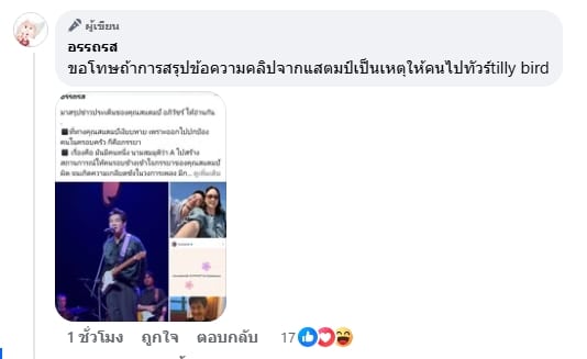ล่าสุดเพจดังอย่าง อรรถรส ก็ได้ออกมาโพสต์ขอโทษหนุ่ม ๆ วง Tilly birds เช่นเดียวกันที่ก่อนหน้านี้สรุปเรื่องราวระหว่าง แสตมป์กับซาวน์ เอ็นจีเนียร์ ของวง Tilly birds ไปแบบผิด ๆ โดยที่ยังไม่ทราบรายละเอียดที่แน่ชัด ทำให้ดูเป็นการชักนำให้ชาวเน็ตที่ได้เข้ามาอ่านสรุปเรื่องราวไปรุมต่อว่าและเอาทัวร์ไปลงวง Tilly birds อย่างหนัก โดยทางเพจได้โพสต์ข้อความขอโทษระบุว่า