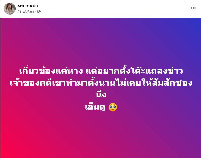 ต่อมา ทนายนิด้าก็โพสต์อีกครั้งว่า “มีคนส่งมาให้ดู เขาคงเข้าใจว่า ทนายเดอาจจะโพสต์ว่านิด้า แต่นิด้าว่า ทนายเดไม่ได้หมายถึงนิด้าหรอกค่ะ เพราะเขาด่าทนายที่เอาตัวรอดไม่ได้ แต่นิด้าเอาตัวรอดได้ค่ะ ทนายที่เอาตัวไม่รอดจะเคยชนะคดีทนายเดมาได้อย่างไร ถูกมั้ยนะคะ”