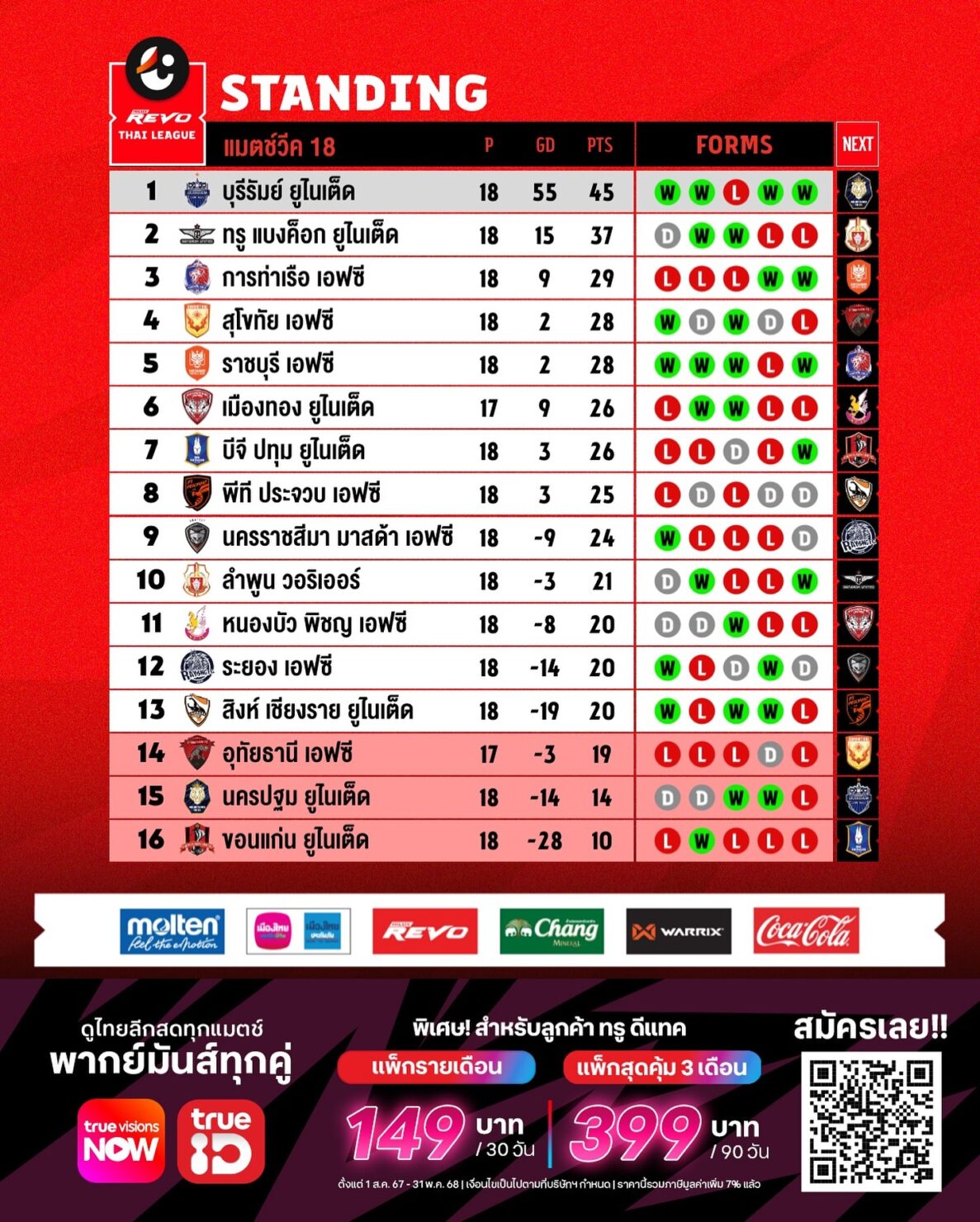- บุรีรัมย์ ยูไนเต็ด แข่ง 18 นัด มี 45 แต้ม