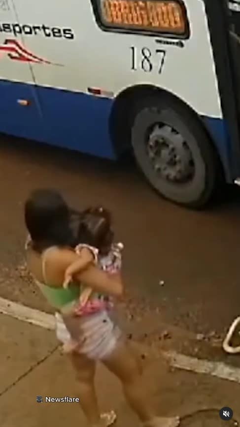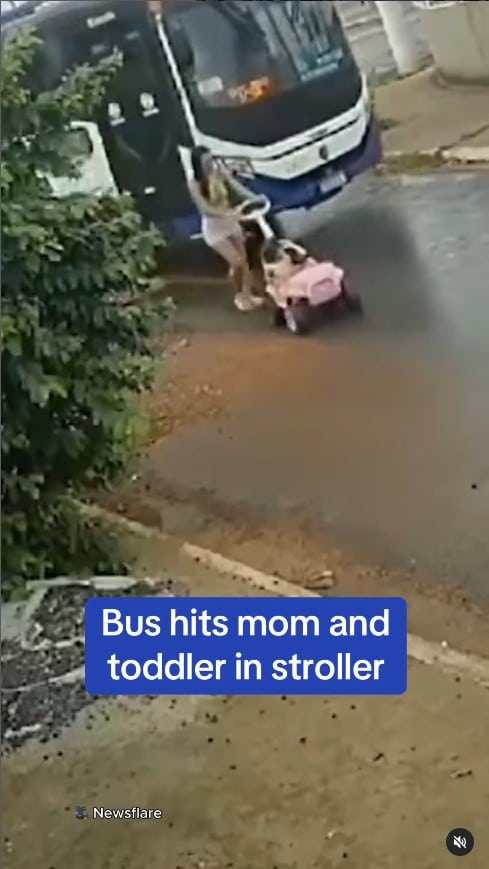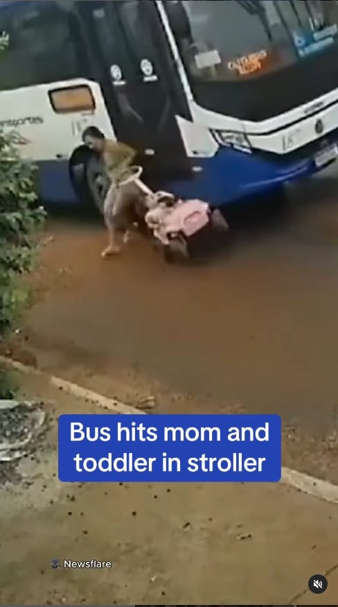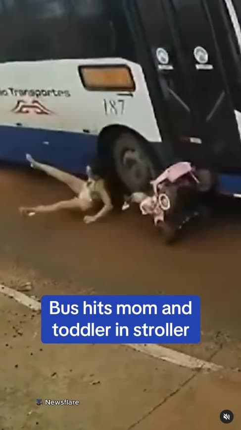 หวิดสลด คุณแม่ยังสาวลื่นพื้นถนน เจอรถเมล์เบียดเสียหลัก ลากรถเข็นลูก โชคดีรถไม่ทับร่าง