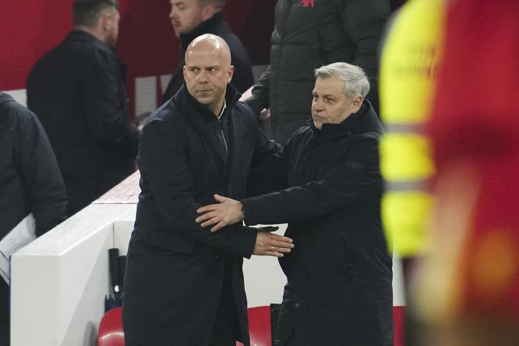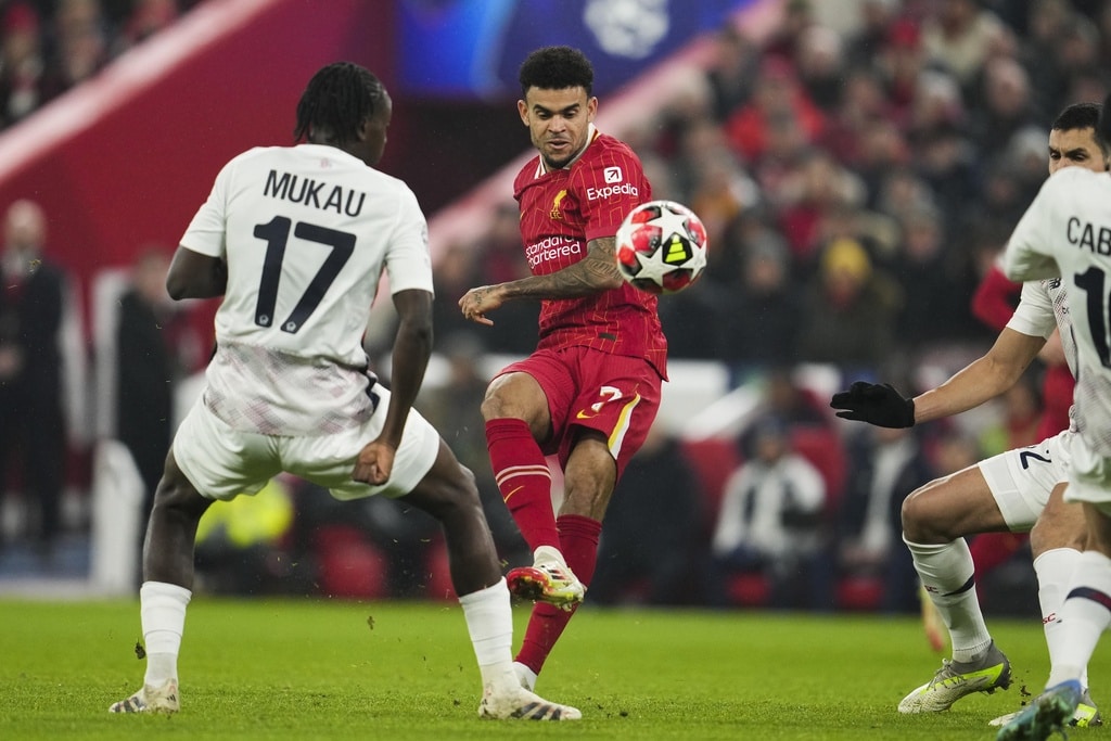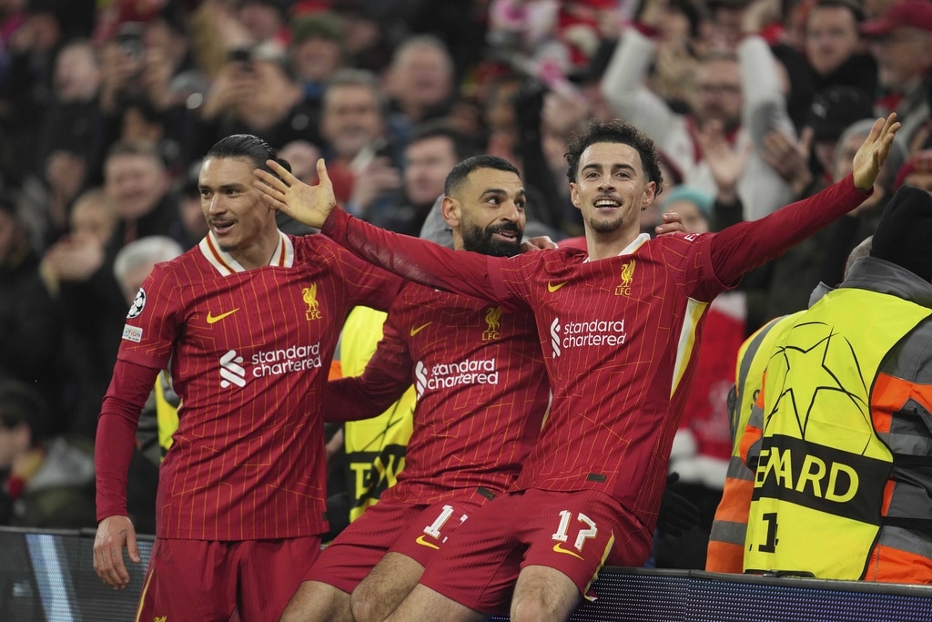 Liverpool’s Luis Diaz makes an attempt to score during the Champions League, opening phase soccer match between Liverpool and Lille at Anfield Stadium, Liverpool, England, Tuesday, Jan.21, 2025. (AP Photo/Jon Super)Liverpool’s manager Arne Slot cheers with Lille’s head coach Bruno Genesio at the end of the Champions League, opening phase soccer match between Liverpool and Lille at Anfield Stadium, in Liverpool, England, Tuesday, Jan.21, 2025. (AP Photo/Jon Super)Liverpool’s Federico Chiesa heads the ball as Lille’s Hakon Arnar Haraldsson jumps on the his side during the Champions League, opening phase soccer match between Liverpool and Lille at Anfield Stadium, in Liverpool, England, Tuesday, Jan.21, 2025. (AP Photo/Jon Super)Liverpool’s Kostas Tsimikas challenges for the ball with Lille’s Aissa Mandi during the Champions League, opening phase soccer match between Liverpool and Lille at Anfield Stadium, Liverpool, England, Tuesday, Jan.21, 2025. (AP Photo/Jon Super)Liverpool’s Mohamed Salah challenges for the ball with Lille’s Gabriel Gudmundsson during the Champions League, opening phase soccer match between Liverpool and Lille at Anfield Stadium, in Liverpool, England, Tuesday, Jan.21, 2025. (AP Photo/Jon Super)Liverpool’s Mohamed Salah, center celebrates with his teammates Darwin Nunez and Curtis Jones after scoring his side’s first goal during the Champions League, opening phase soccer match between Liverpool and Lille at Anfield Stadium, Liverpool, England, Tuesday, Jan.21, 2025. (AP Photo/Jon Super)Liverpool’s Mohamed Salah scores his side’s first goal during the Champions League, opening phase soccer match between Liverpool and Lille at Anfield Stadium, Liverpool, England, Tuesday, Jan.21, 2025. (AP Photo/Jon Super)