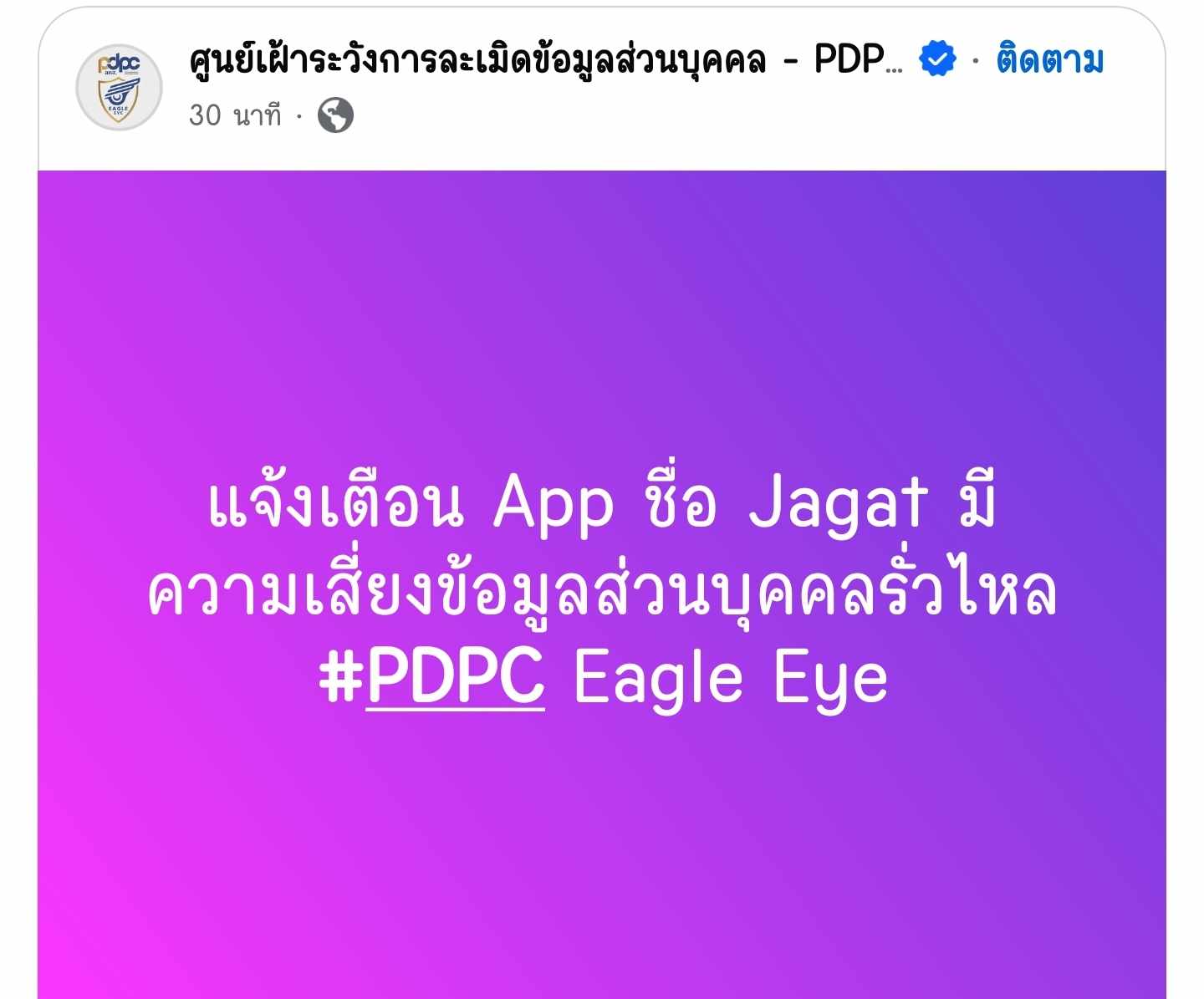 ศูนย์เฝ้าระวังการละเมิดข้อมูลส่วนบุคคล (PDPC Eagle Eye) ออกประกาศเตือน พบแอปพลิเคชันเหรียญ “Jagat” มีความเสี่ยงข้อมูลส่วนบุคคลรั่วไหล แต่ยังไม่มีการเปิดเผยรายละเอียดเพิ่มเติมเกี่ยวกับช่องโหว่ หรือลักษณะการรั่วไหลของข้อมูล