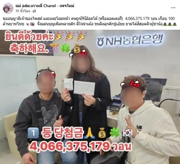 ต่อมาเพจดังกล่าวก็ได้ออกมาโพสต์ภาพ คนไทยในเกาหลี ผู้โชคดีถูกลอตโต้ ในงวดวันที่ 18 ม.ค. 68 พร้อมระบุแคปชั่นว่า “ขออนุญาติเจ้าของโพสต์ และเผยโฉมหน้า คนถูกล๊อตโต้ (หรือลอตเตอรี่) 4,066,375,179 วอน เกือบ 100 ล้านบาทไทย จั้งแม่นบุญเพิลหลายคัก ดีใจนำเด้อ ขนคิงลุกคักปู่เอ้ยย ยามได๋สิฮอดคิวผู้ข่าน้อ”