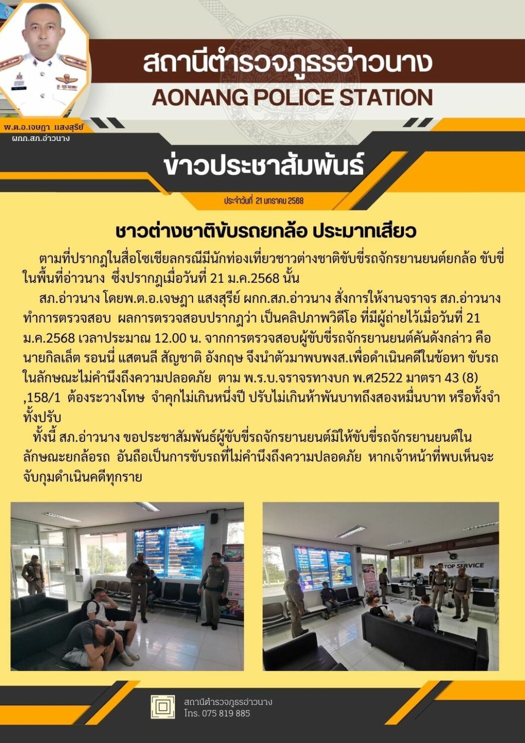 สภ.อ่าวนาง จ.กระบี่ ได้ออกจดหมายข่าว ระบุข้อความว่า ตามที่ปรากฏในสื่อโซเชียล กรณีมีนักท่องเที่ยวชาวต่างชาติขับขี่จยย.ยกล้อในพื้นที่อ่าวนาง เมื่อวันที่ 21 ม.ค.68 ที่ผ่านมา สภ.อ่าวนาง โดย พ.ต.อ.เจษฎา แสงสุรีย์ ผกก.สภ.อ่าวนาง ได้สั่งการให้งานจราจร สภ.อ่าวนาง ทำการตรวจสอบแล้วพบว่า ผู้ขับขี่รายดังกล่าวคือ นายกิลเล็ต รอนนี่ แสตนลี่ สัญชาติอังกฤษ