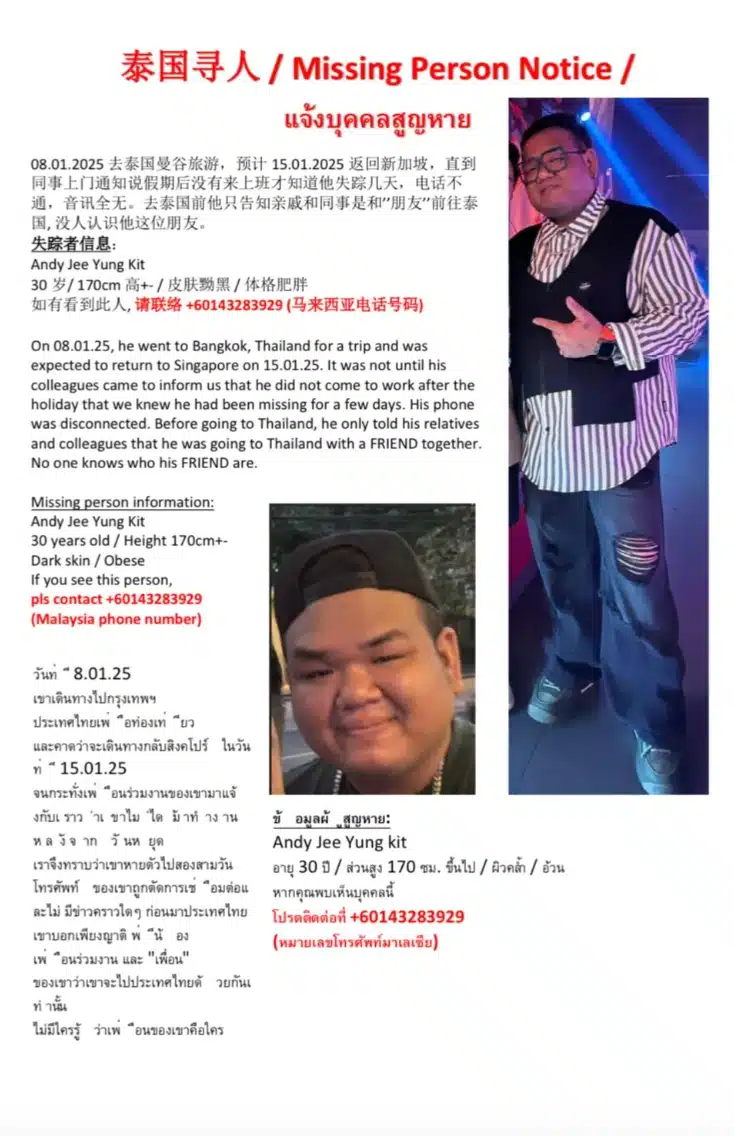 ญาติตามหาตัว ชายชาวมาเลเซีย ที่ทำงานในสิงคโปร์ หายตัวปริศนาขณะมาท่องเที่ยวที่ประเทศไทย เร่งขอความช่วยเหลือ