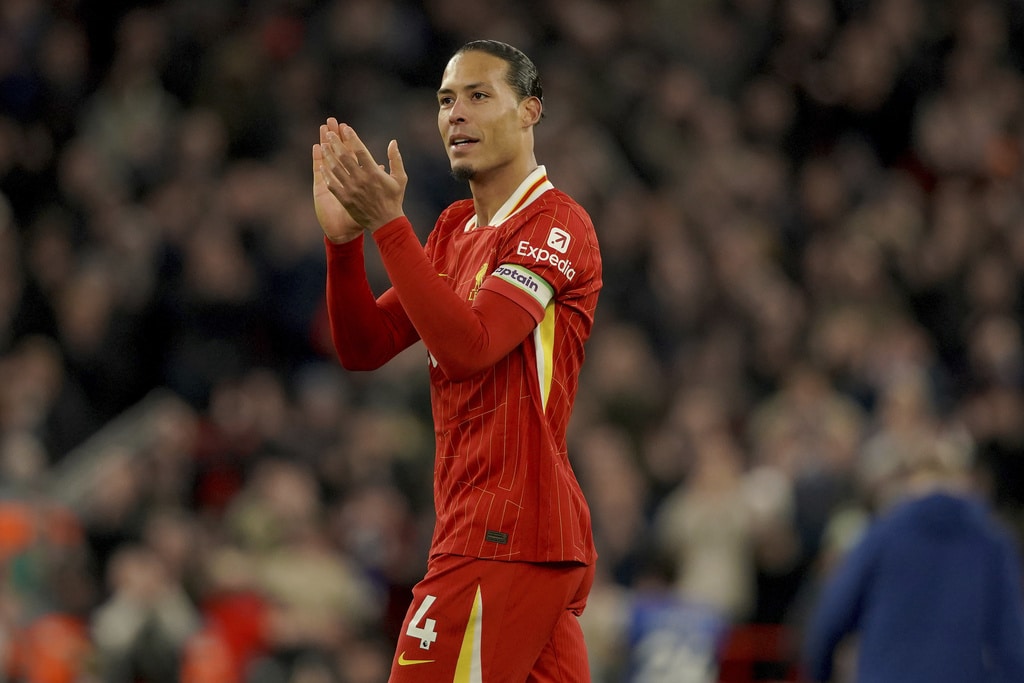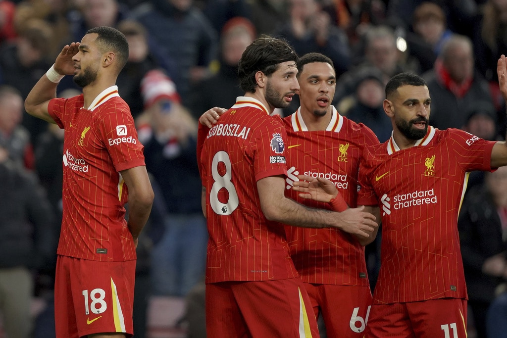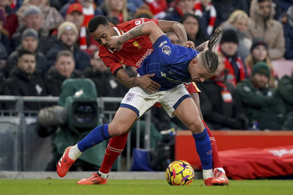 Ipswich Town’s Leif Davis, right, and Liverpool’s Mohamed Salah challenge for the ball during the English Premier League soccer match between Liverpool and Ipswich Town at Anfield Stadium in Liverpool, Saturday, Jan. 25, 2025.(AP Photo/Ian Hodgson)Liverpool’s Virgil van Dijk applauds to supporters after the English Premier League soccer match between Liverpool and Ipswich Town at Anfield Stadium in Liverpool, Saturday, Jan. 25, 2025.(AP Photo/Ian Hodgson)Liverpool’s Darwin Nunez, centre, and Ipswich Town’s Jacob Greaves, left, challenge for the ball during the English Premier League soccer match between Liverpool and Ipswich Town at Anfield Stadium in Liverpool, Saturday, Jan. 25, 2025.(AP Photo/Ian Hodgson)Liverpool’s Cody Gakpo, from left, Liverpool’s Dominik Szoboszlai, Liverpool’s Trent Alexander-Arnold and Liverpool’s Mohamed Salah celebrate after scoring their side’s fourth goal during the English Premier League soccer match between Liverpool and Ipswich Town at Anfield Stadium in Liverpool, Saturday, Jan. 25, 2025.(AP Photo/Ian Hodgson)Liverpool’s Ryan Gravenberch, left, and Ipswich Town’s Kalvin Phillips challenge for the ball during the English Premier League soccer match between Liverpool and Ipswich Town at Anfield Stadium in Liverpool, Saturday, Jan. 25, 2025.(AP Photo/Ian Hodgson)Ipswich Town’s Liam Delap, right, and Liverpool’s Ibrahima Konate challenge for the ball during the English Premier League soccer match between Liverpool and Ipswich Town at Anfield Stadium in Liverpool, Saturday, Jan. 25, 2025.(AP Photo/Ian Hodgson)Ipswich Town’s Liam Delap, right, and Liverpool’s Ryan Gravenberch challenge for the ball during the English Premier League soccer match between Liverpool and Ipswich Town at Anfield Stadium in Liverpool, Saturday, Jan. 25, 2025.(AP Photo/Ian Hodgson)