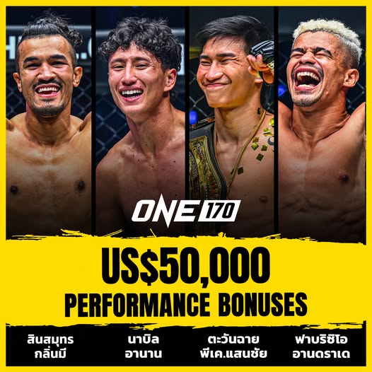 สำหรับนักกีฬาผลงานเด่นที่รับรางวัลโบนัสอัดฉีดในศึกนี้มีทั้งหมด 4 คน ได้แก่ “สินสมุทร กลิ่นมี”, “นาบิล อานาน”, “ฟาบริซิโอ อานดราเด” และ “ตะวันฉาย พีเค.แสนชัย” หลังต่างงัดฟอร์มเก่งเข้าตาบิ๊กบอส “ชาตรี ศิษย์ยอดธง” คว้าเงินรางวัลคนละ 50,000 ดอลลาร์สหรัฐ (กว่า 1.7 ล้านบาท) รวมยอดทั้งสิ้นมากกว่า 6.8 ล้านบาท (หกล้านแปดแสนบาท) ในอีเวนต์เดียว รวมถึงแจกรางวัลพิเศษ ONE ซูเปอร์แฟน ให้กับผู้ชมในสนามอีก 100,000 บาท